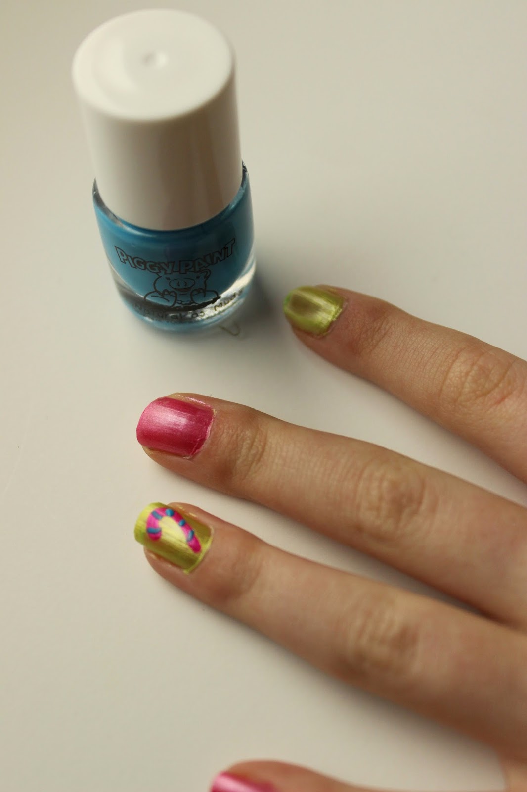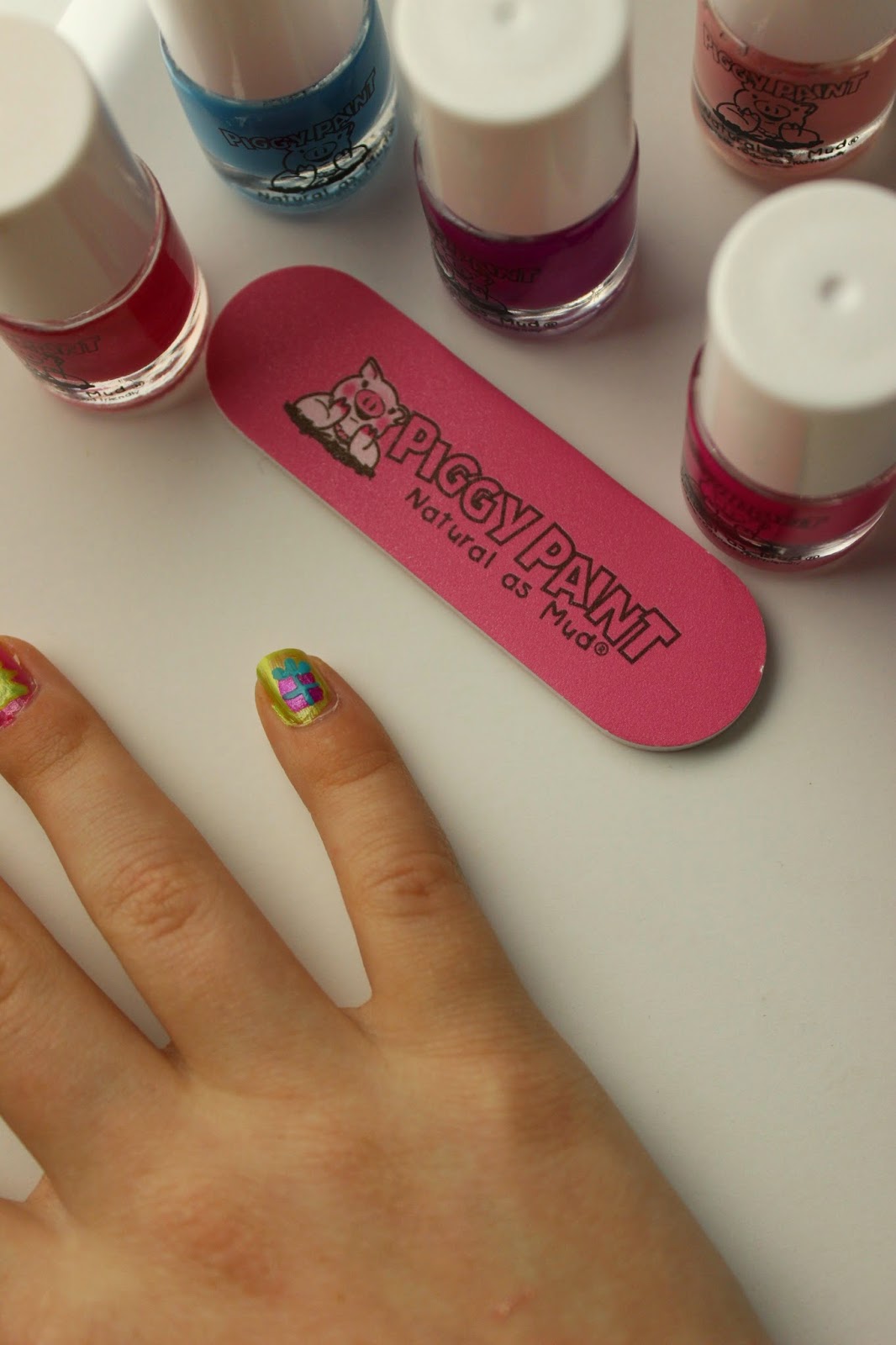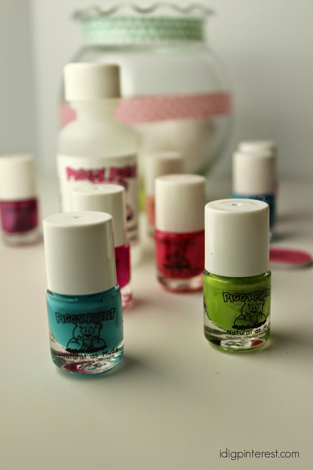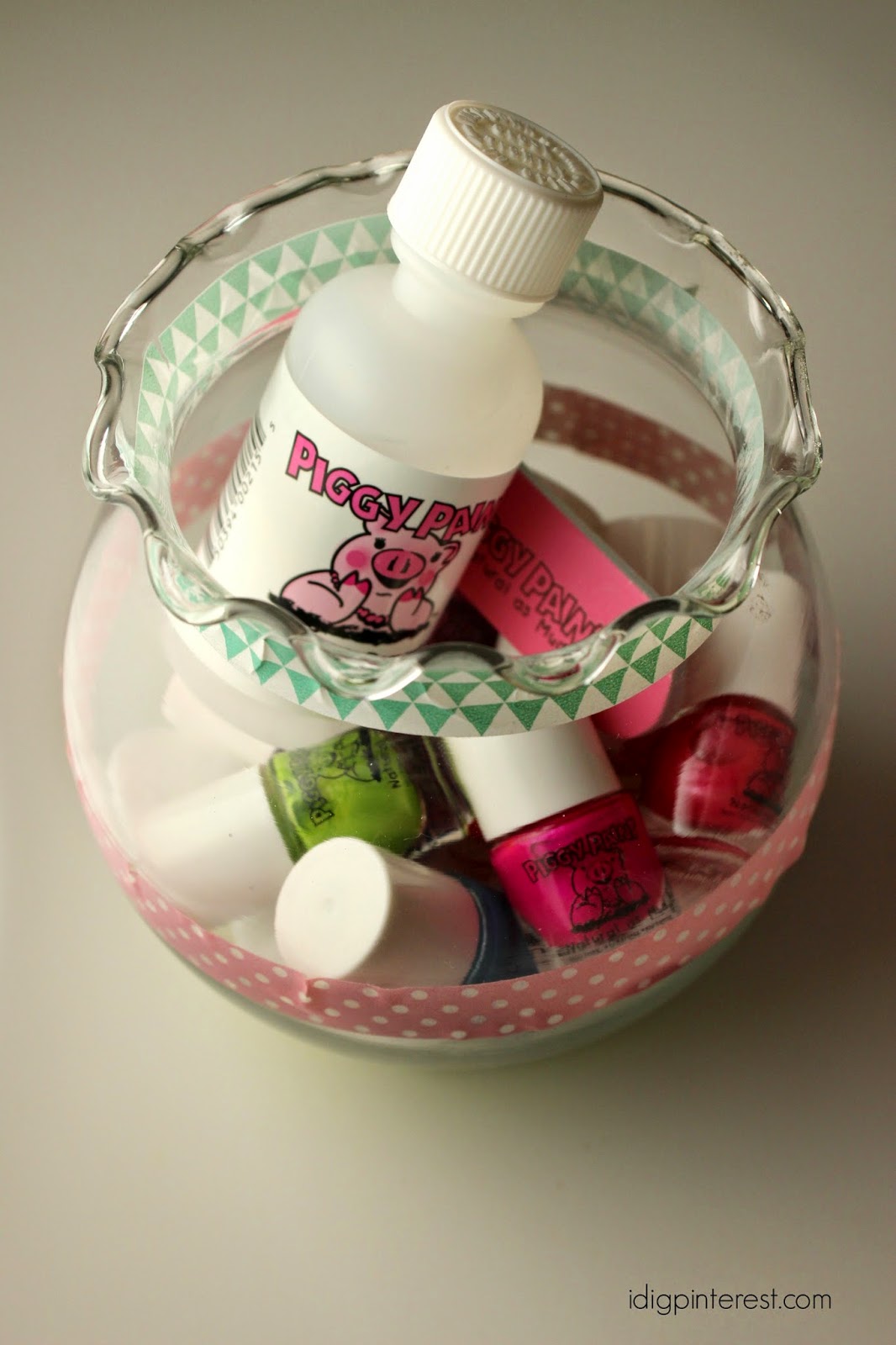 I whipped up a fun washi tape-decorated jar to hold our new treasures, layered some cotton balls on the bottom, followed by our cute (and I might add, eco-friendly) Piggy Paints, a file and remover. We were set!