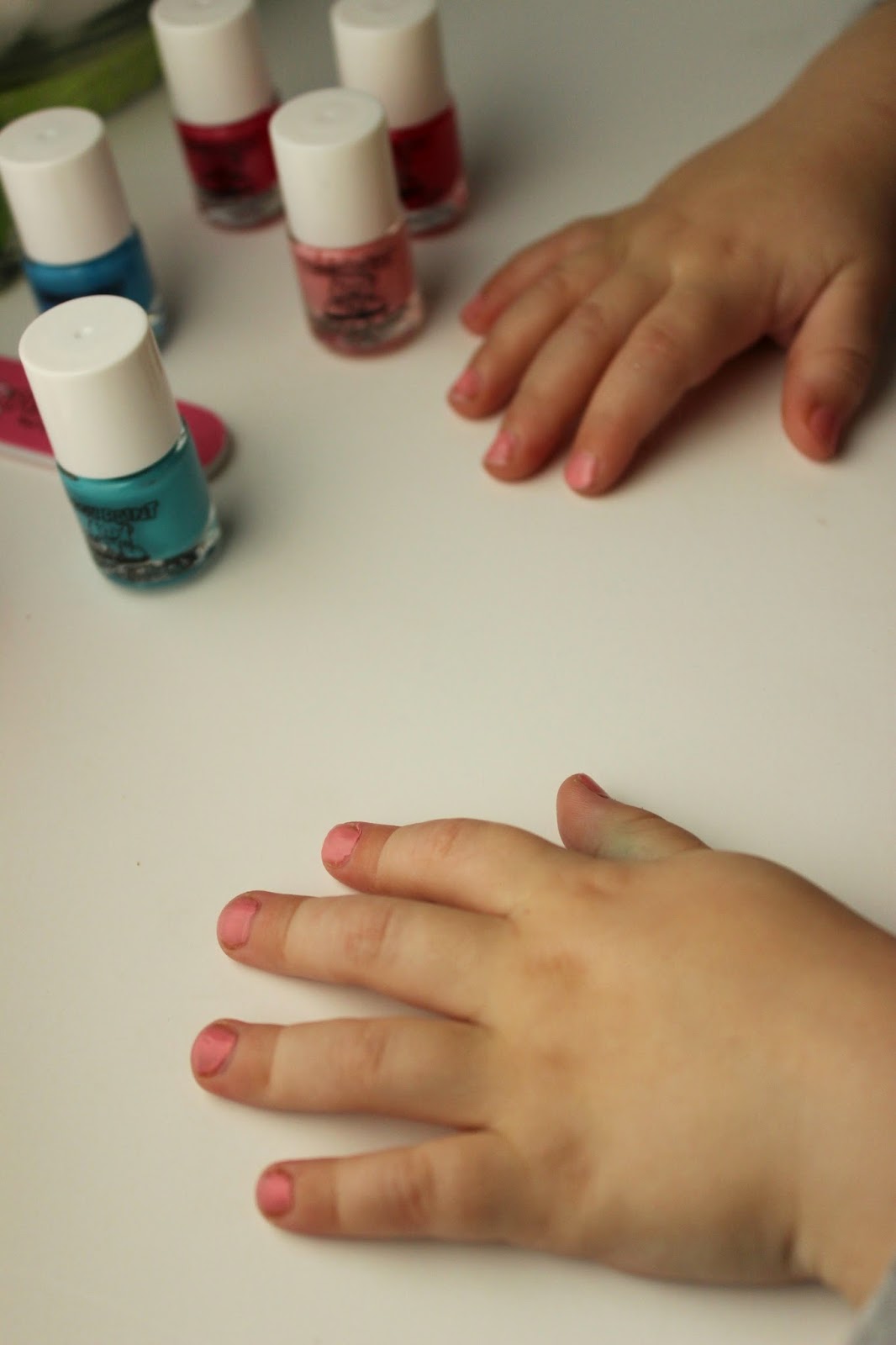 My two-year-old couldn’t keep her hands off the fun polishes, so I painted her nails first to appease her anticipation.