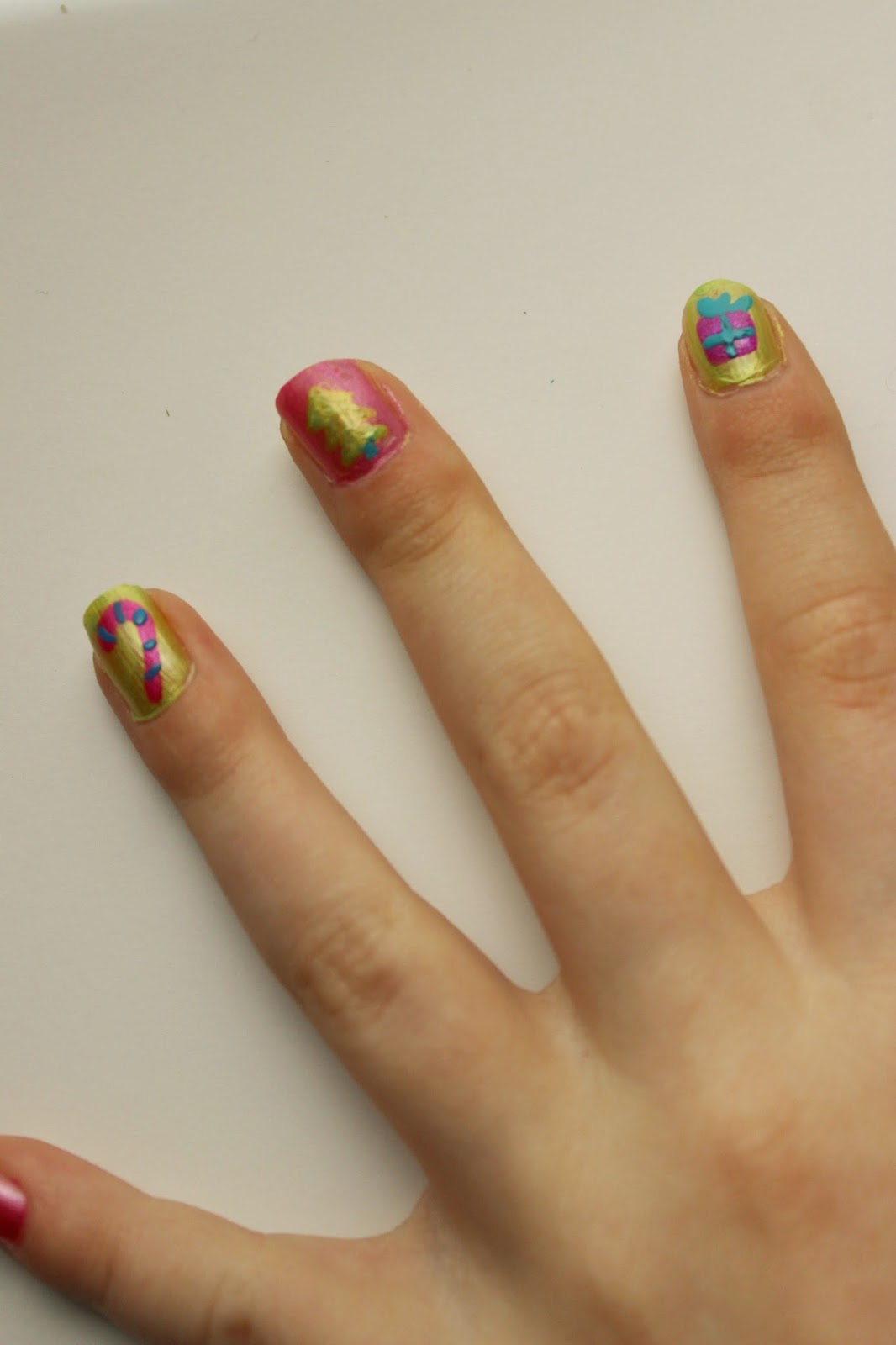 Next, I drew on a Christmas tree using the same method-drawing the outline with a toothpick, then filling it in with little dabs of polish on the toothpick.