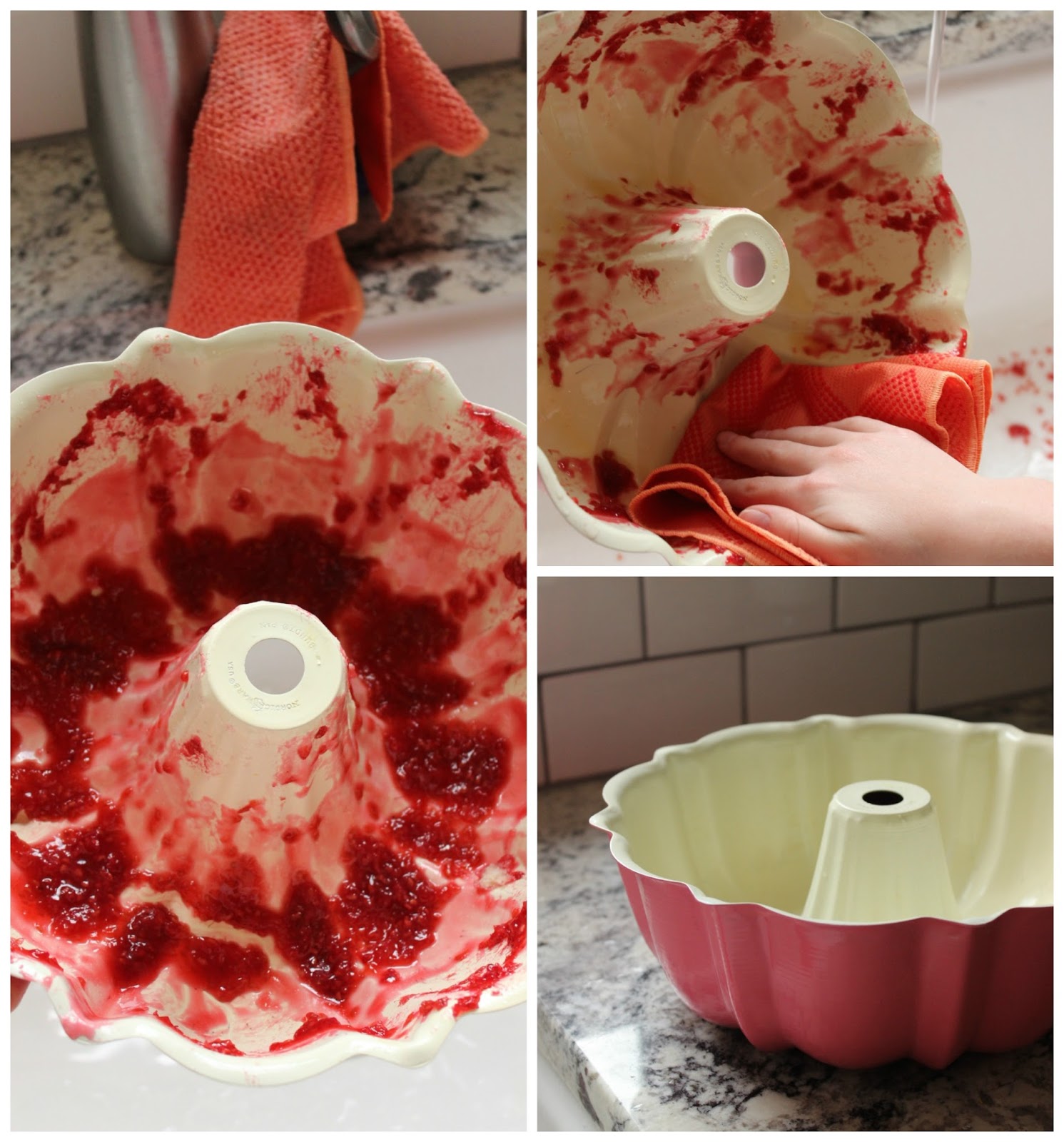 I made it in my cute pink bundt cake pan that is hand wash only, so I quickly rinsed out the remaining raspberry sauce, then added some liquid dish soap and used the scrubbing side of the Scotch-Brite® Scrubbing Dish Cloth to remove the buildup. Easy peasy!