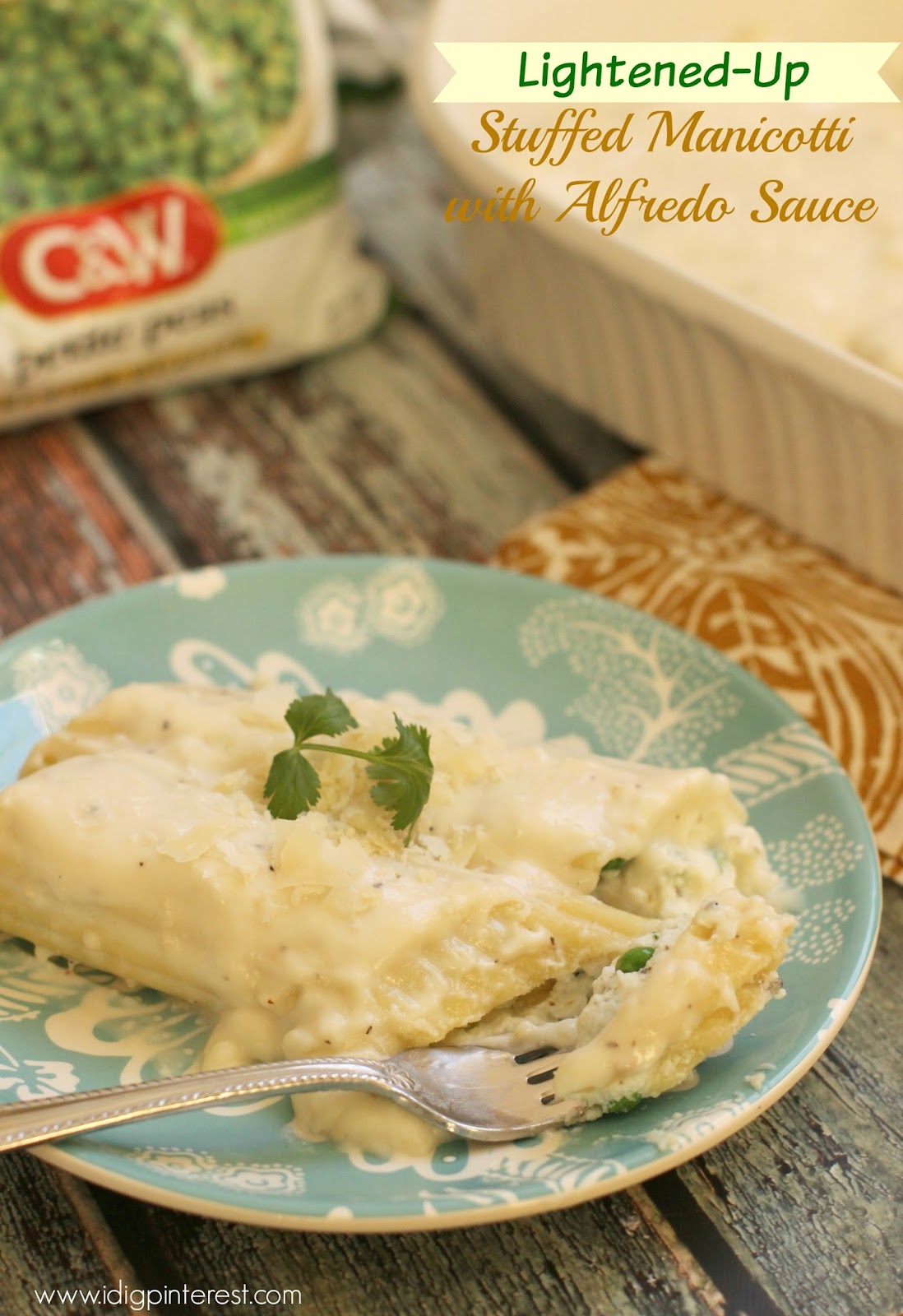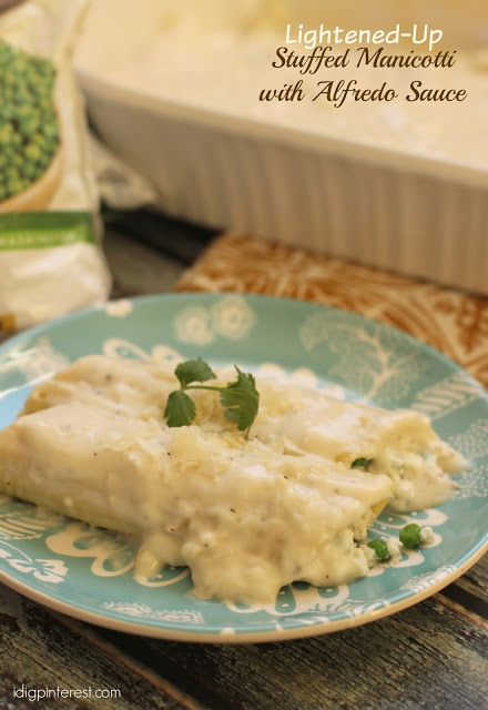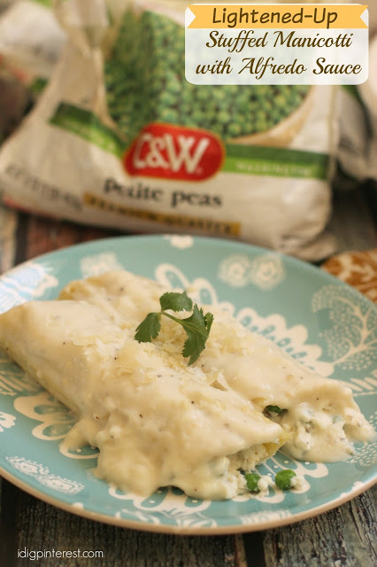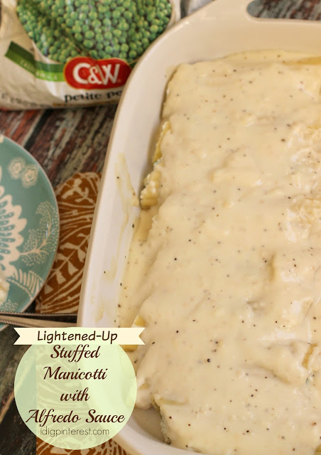 This lightened-up Stuffed Manicotti and Alfredo Sauce is an easy meal with vegetables that’s sure to become a family favorite!