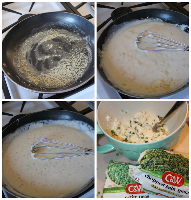 In a separate bowl, stir together ricotta, oregano, Italian seasoning, garlic, salt, pepper, mozzarella, peas, and spinach.
