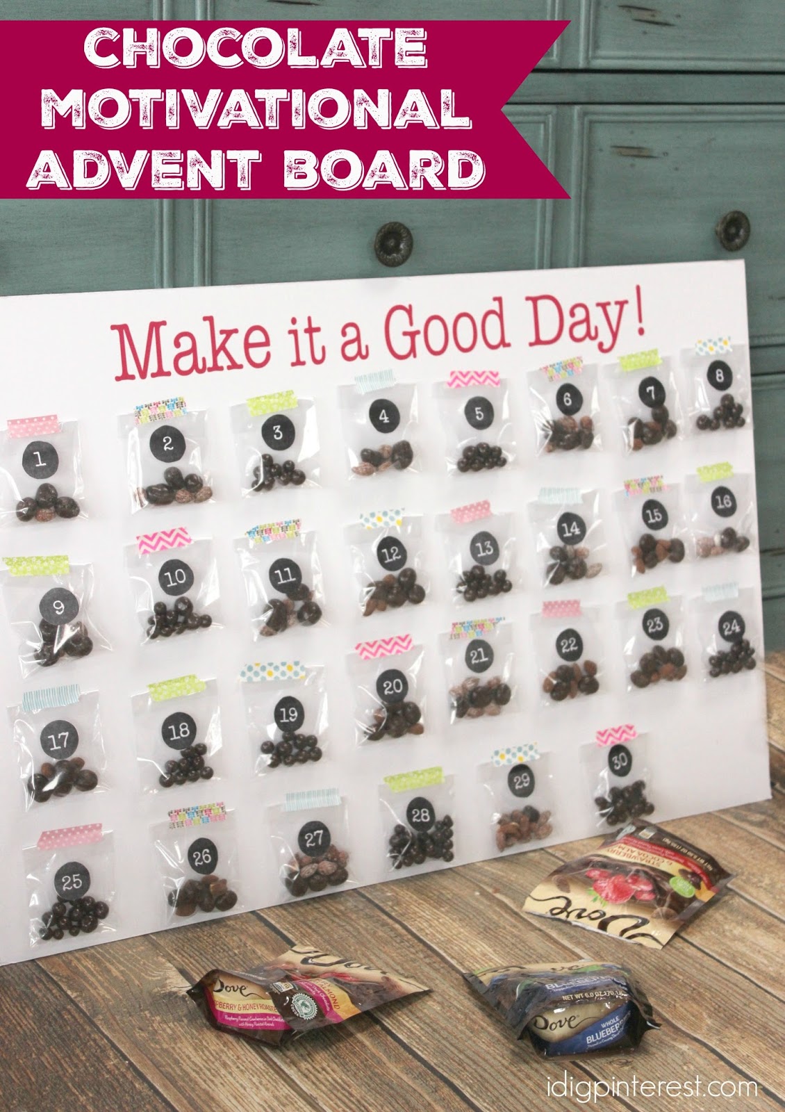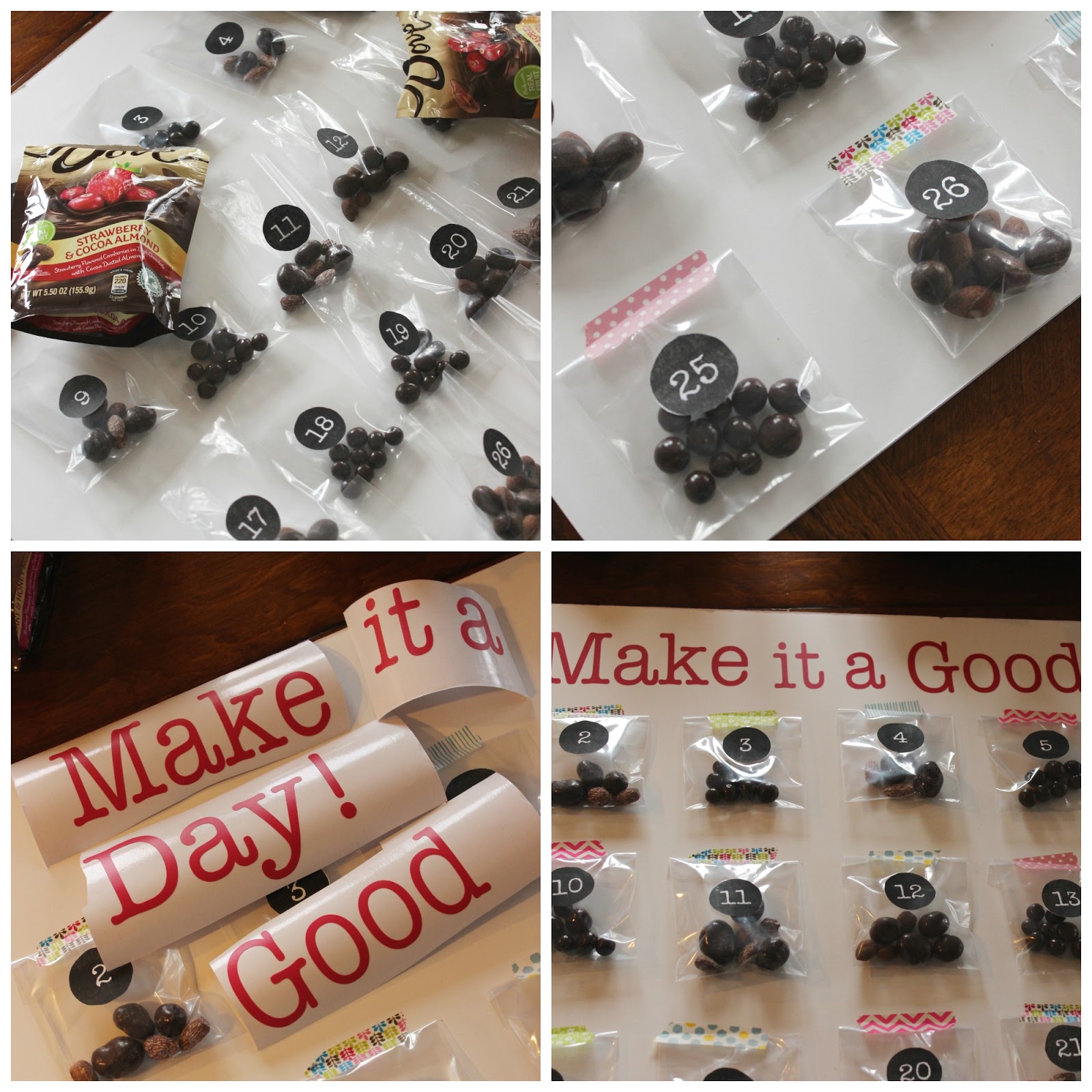 Fill each bag with a variety of DOVE® Chocolate Fruit & Nuts, line the bags up on the board where you want them (I did four rows of 8), and tape them in place with Washi tape. Add your vinyl or hand-written label to the top, and you’re ready to “Make it a good day”!