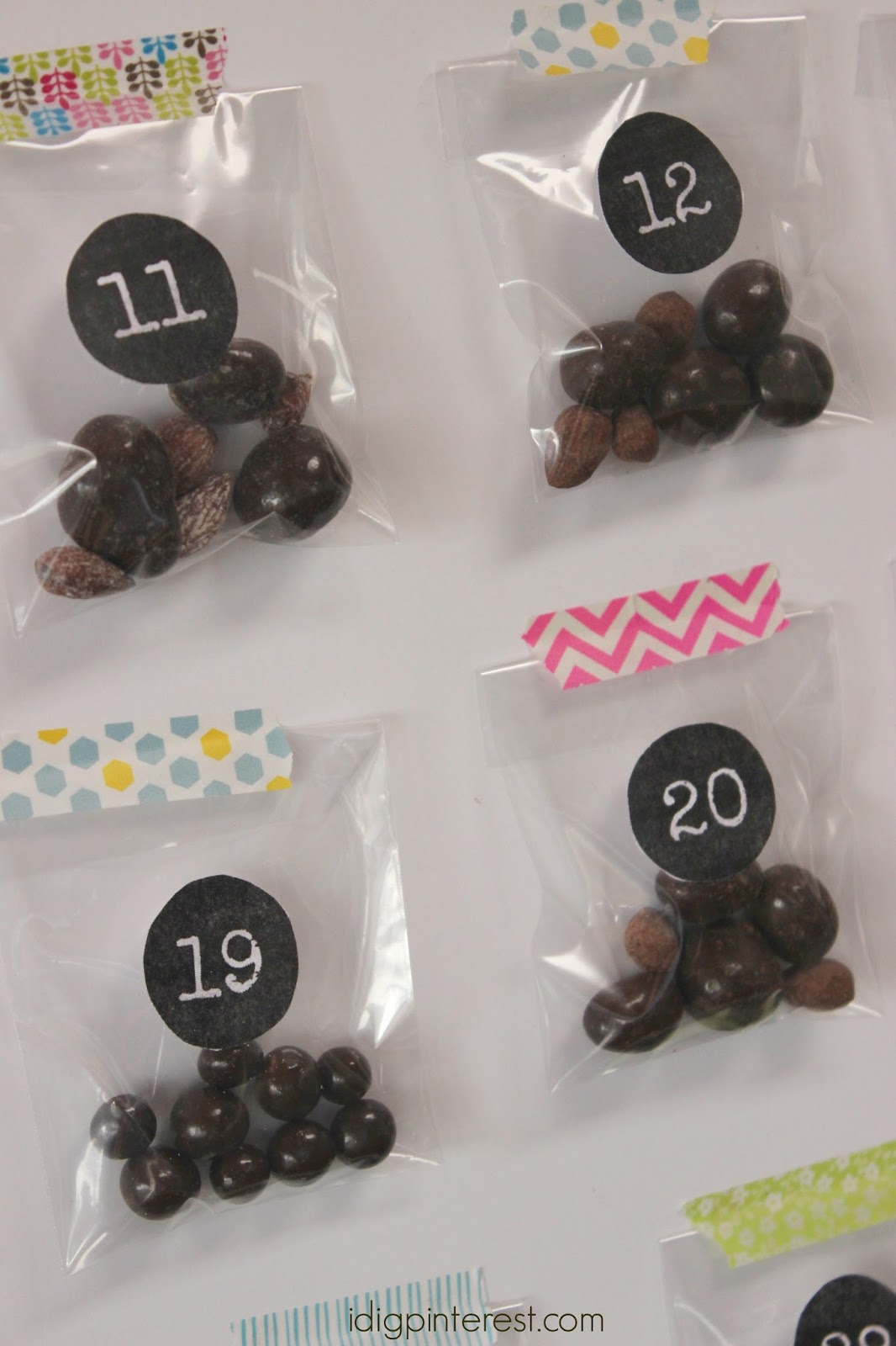 Print the number and cut out the number labels found below. Use double-sided tape to adhere them (one for each day of the month) to the mini bags (mine measured 3″x4″).