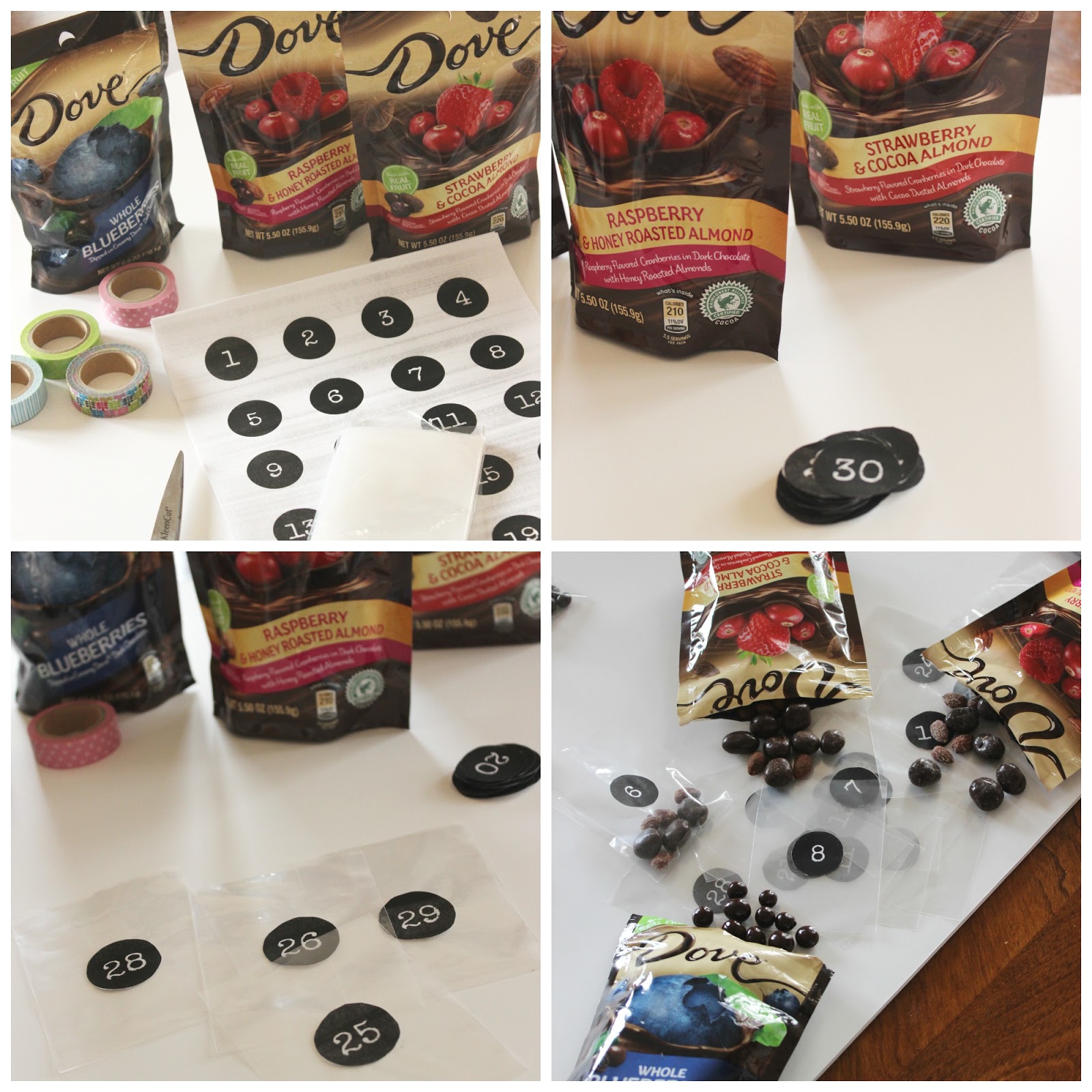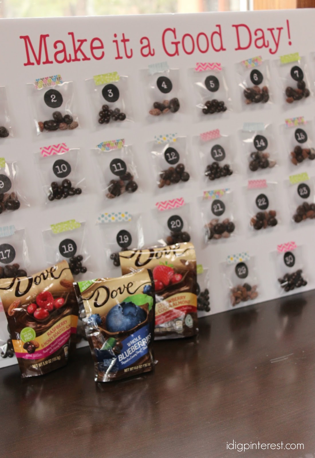 Because chocolate makes every day better, put together this simple advent calendar with mini bags of DOVE® Chocolate Fruit & Nut goodies to grab before heading out the door!