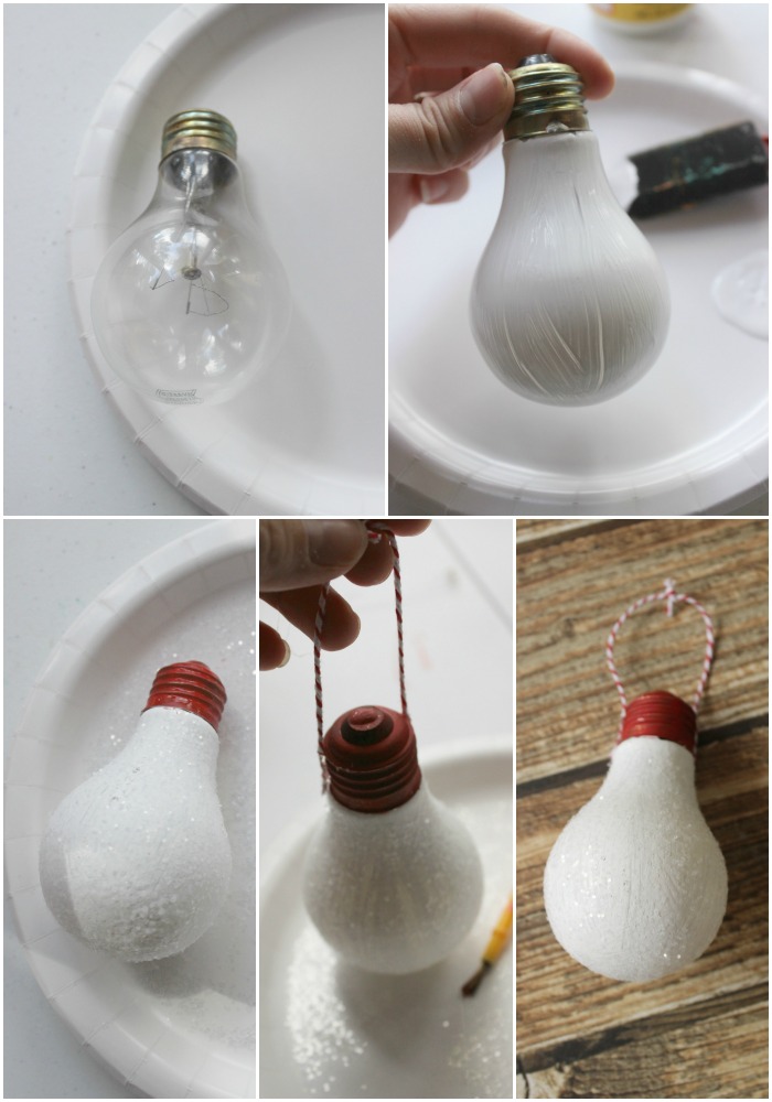 I just love finding ways to repurpose items. So to make this pretty, sparkly ornament, I grabbed an old light bulb from my closet and gave it a few coats of white acrylic paint, allowing it to dry in between. Because I’m an impatient person, I used my blow dryer on a low, cool setting to speed up the process. 🙂