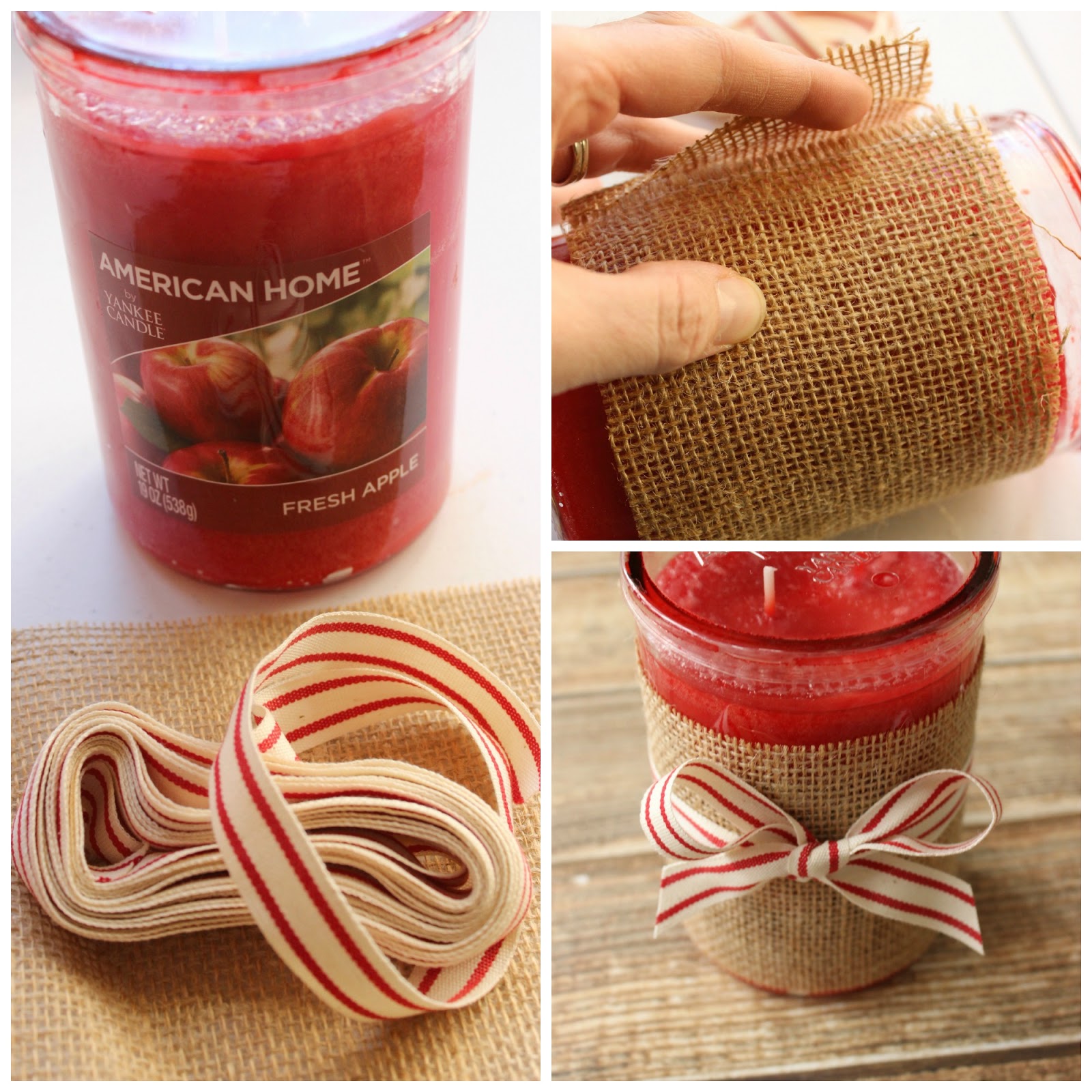 The candle cozy was even easier to make, if that’s saying something. I cut a piece of burlap to go all the way around, hot glued it in the back, then tied a bow in front with a pretty piece of ribbon!