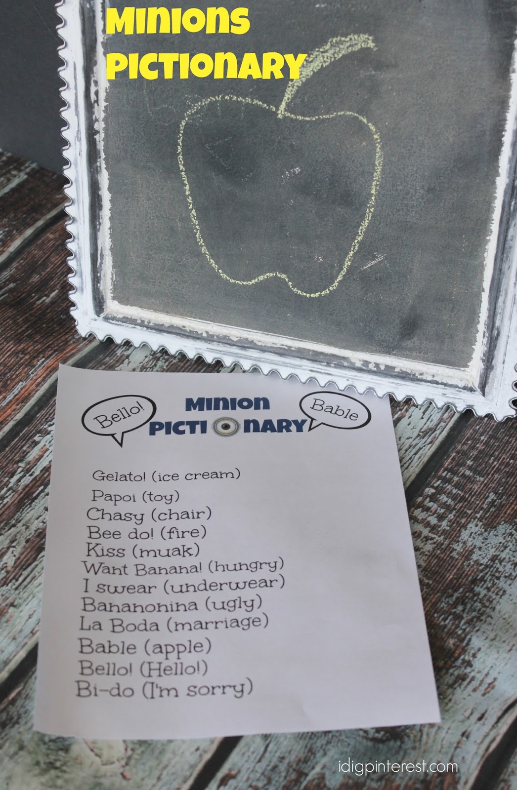 I just can’t get enough of Minions right now, so I also put together a little pictionary game to play with the kiddos this summer when they are bored! Simply whisper the English term that’s in parentheses into a child’s ear, then he or she will draw it and the other players will need to guess what it is, but in Minion language, or the term on the far left. Too fun! It’s sure to provide lots of laughs!