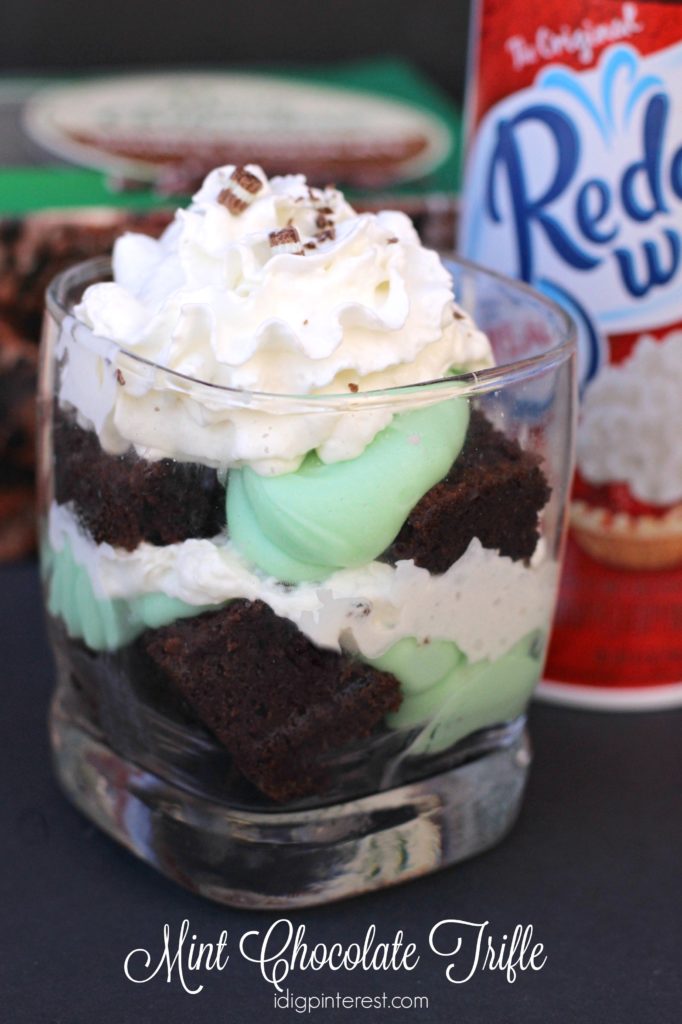 - Prepare trifles by cutting cooled loaf cake into cubes, then layering about 3 cake cubes on the bottom of a small glass cup, followed by a big spoonful of the green mint mixture, then some Reddi-Wip. Repeat layers, finishing with Reddi-Wip and a garnish of mint chocolate curls. Serve immediately.