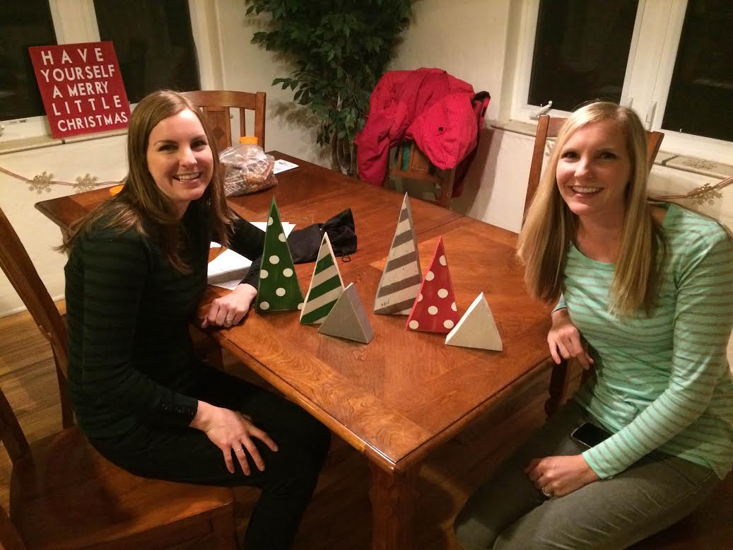 When my sister and her family were visiting here for Thanksgiving, we had a bunch of plans.  Among them were baking sweet treats and crafting up a storm.  She made a pretty burlap wreath one of the mornings and then, after we played a bit with the kids so we didn’t feel like we were totally neglecting them in the name of our “projects”, we made these fun painted Christmas trees!