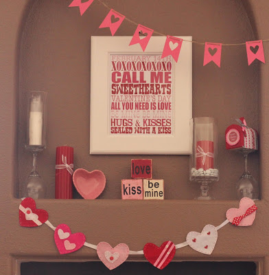 I had so much fun planning and decorating this year’s Valentine’s Mantel, drawing once again from Pinterest for some inspiration. The Heart Flag Banner, as shown on yesterday’s post, was a Pinterest find, as was the free Valentine’s printable shown behind it. The Conversation Blocks and the Mini Mailbox were also Pinterest gems.