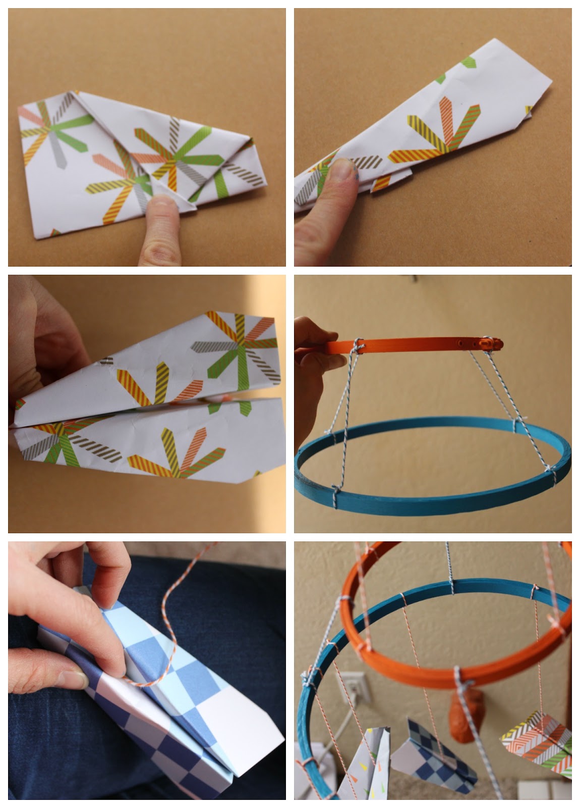 Now fold the entire thing in half so the folds stay on the outside.  Fold the two sides down so they line up exactly with the bottom edge.  Repeat this process for the remaining five airplanes (or however many you’d like), using coordinating patterned paper.  Tie 4 or more pieces of baker’s twine of equal length and at an equal distance apart to the smallest hoop and then tie them to the larger hoop.  Trim the ends.
