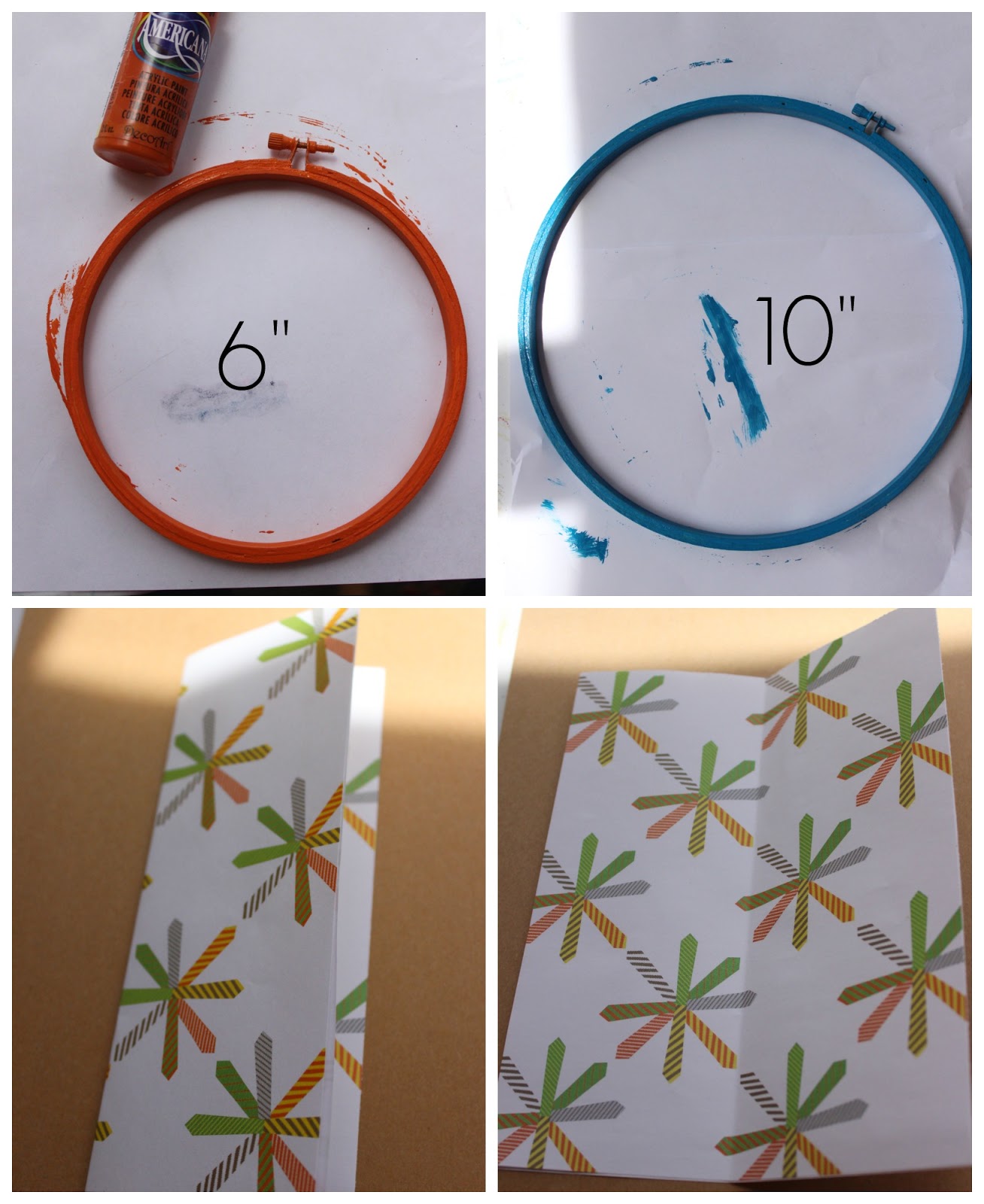 Begin by painting your embroidery hoops and allowing them to dry while you make the paper airplanes.
