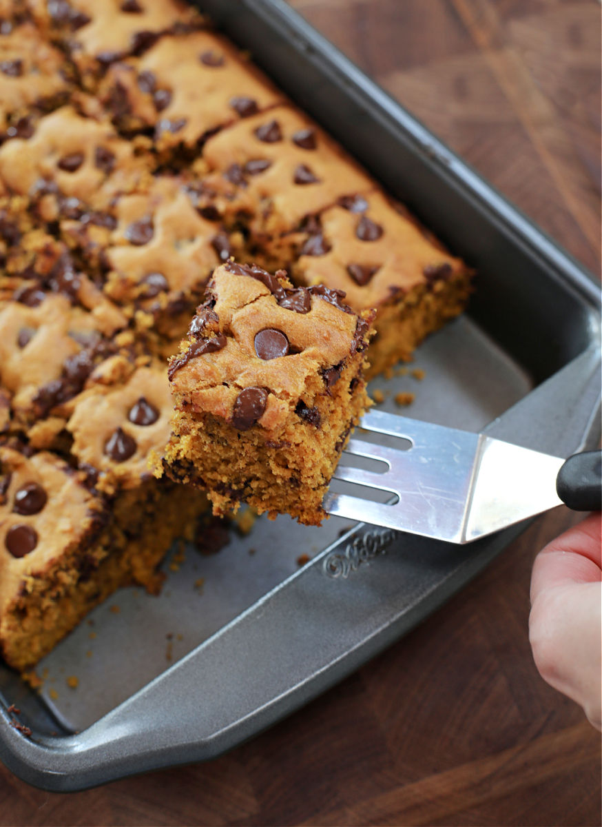 These Phenomenal Pumpkin Chocolate Chip Bars will blow your mind! If you’re a pumpkin and pumpkin spice lover, you’ve got to make this incredible dessert very soon! These bars are tall, soft, cake-like and studded with loads of melty chocolate chips! Talk about divine!