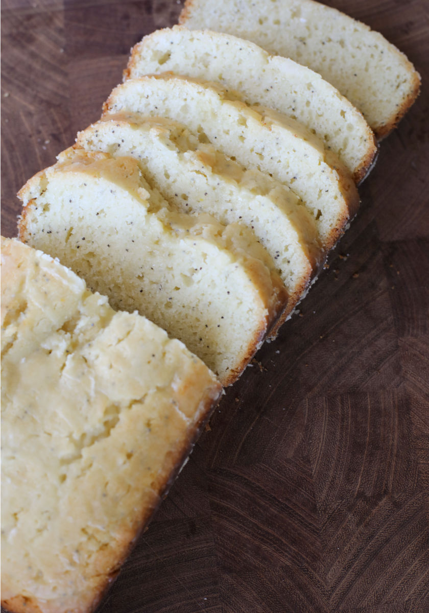 When I think of Poppyseed Bread, I think of baby showers, wedding showers and backyard potlucks. I love to make desserts like this when I’m asked to bring something to a gathering. You can cut each slice in half to make it go further, so the two loaves feed and please a crowd!