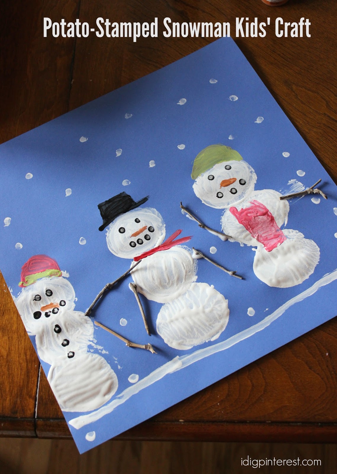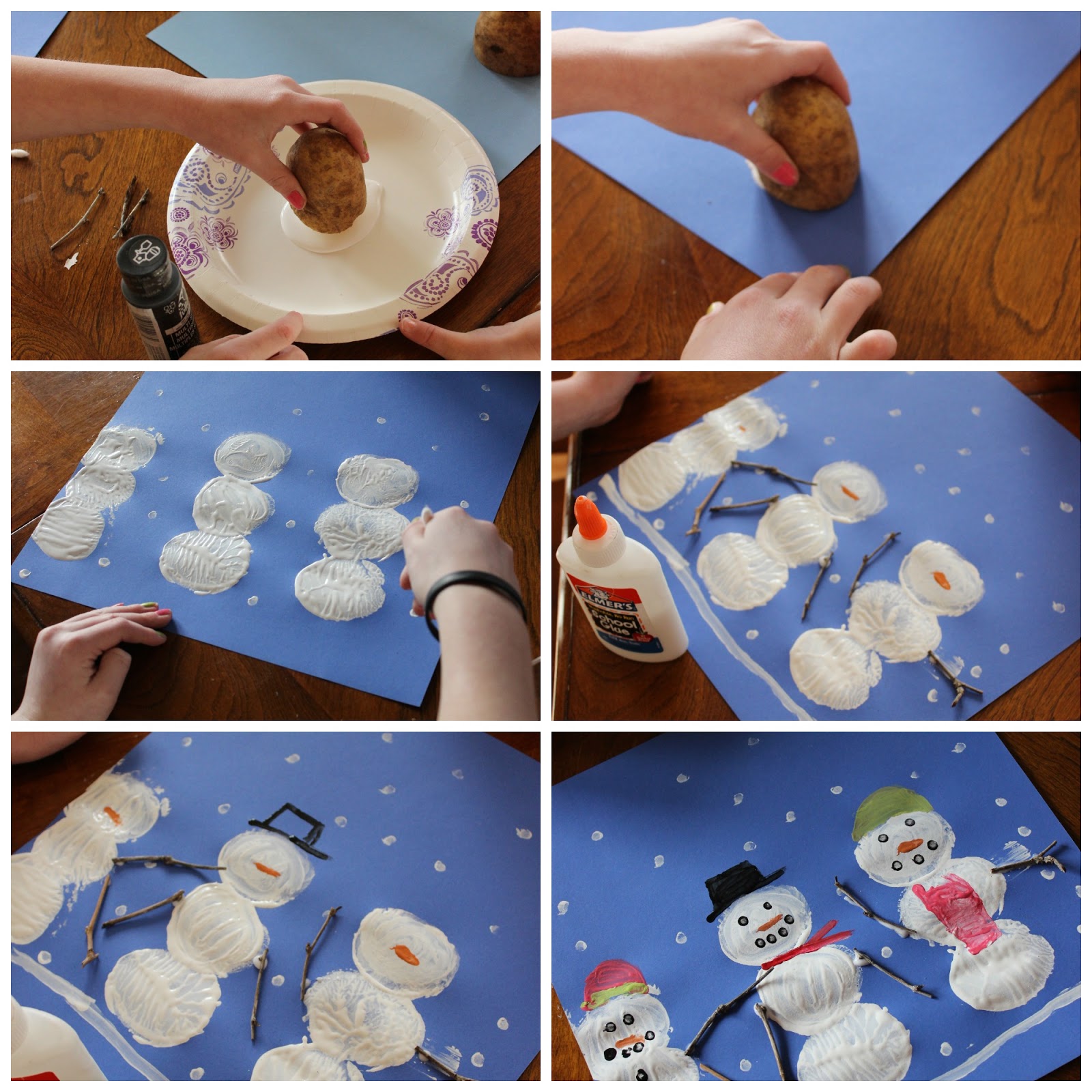 Instructions: Use your potatoes to dip and stamp the snowmen bodies onto the cardstock. My kids decided to make a family of snowmen. Glue on twigs for arms and use Q-tips to paint on snowflakes in the sky and snowmen hats, faces, scarves, and buttons. Allow to dry and display around the house for all to see!