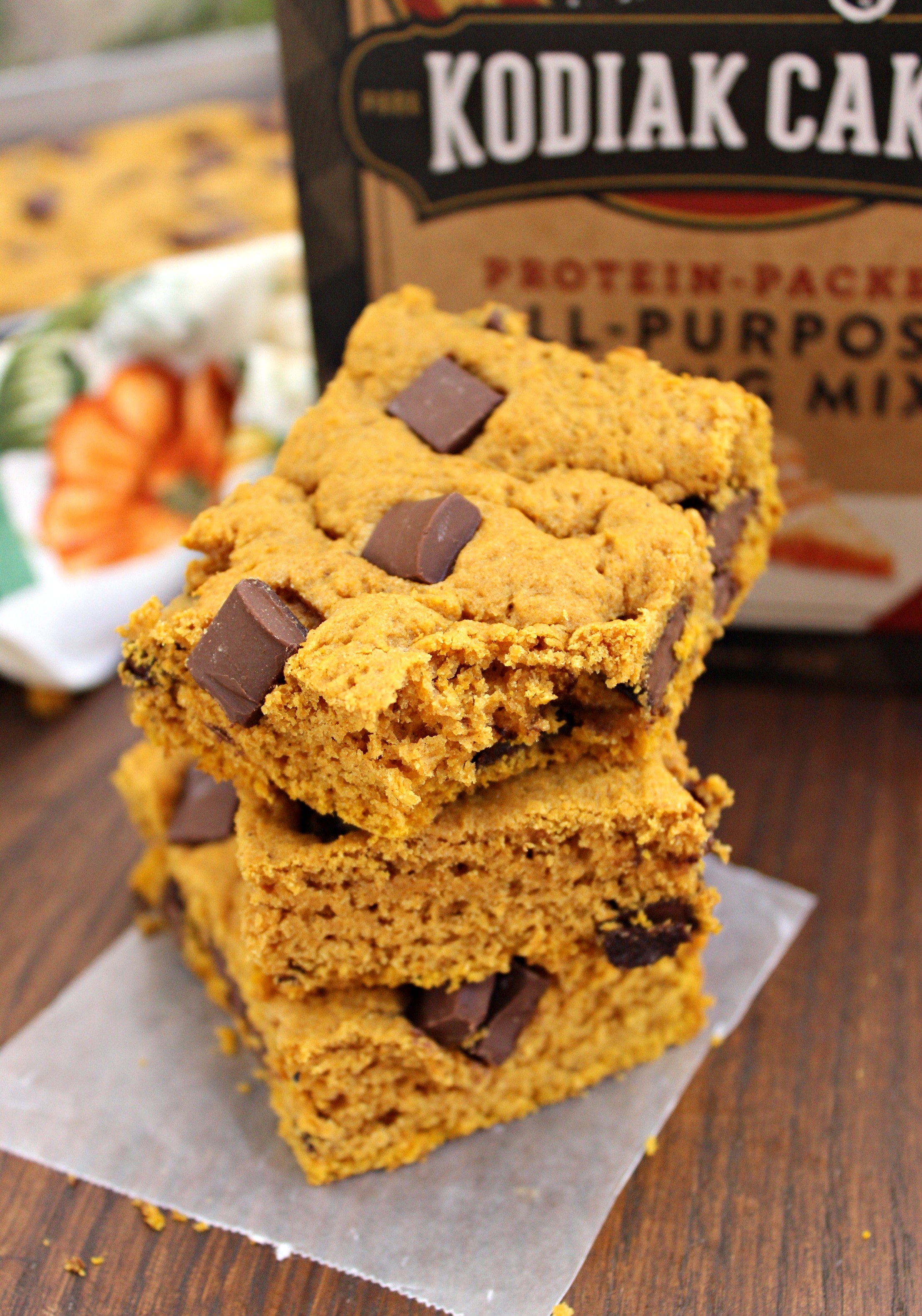 - Preheat oven to 350 degrees Fahrenheit and grease a 9x13" cake pan. In the bowl of an electric mixer, add the Kodiak Cakes All-Purpose Baking Mix, egg, brown sugar, baking powder, baking soda, cinnamon, nutmeg, vanilla, canned pumpkin, softened butter and 1 c. chocolate chunks. Mix until incorporated and press into prepared pan. Sprinkle and press remaining 1/2 cup chocolate chunks on top.