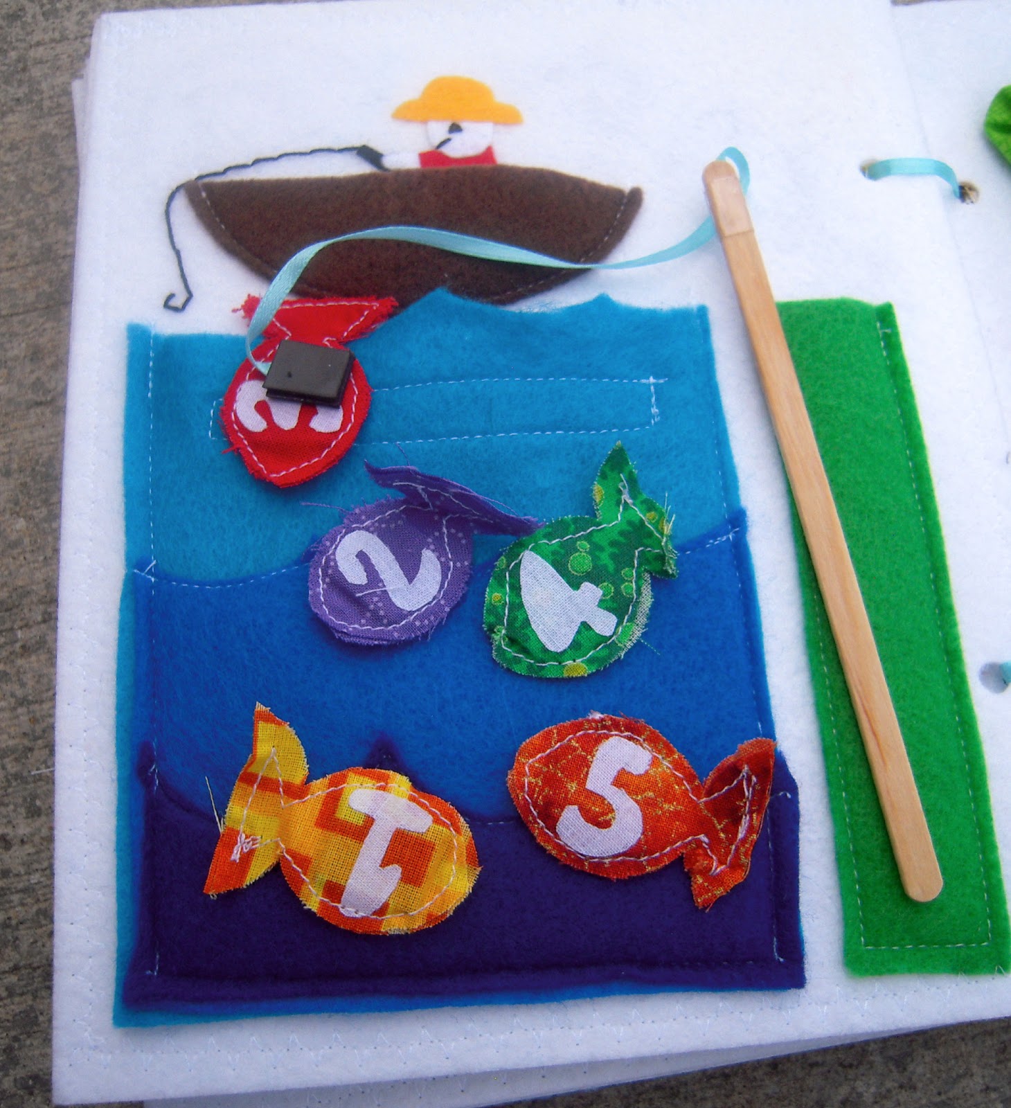 I was pretty proud of myself for figuring out a cheap way to make a fishing pole – I used a leftover corn dog stick! The fishing pole has a magnet stuck to the end of it and the fish have magnets sewn into them.