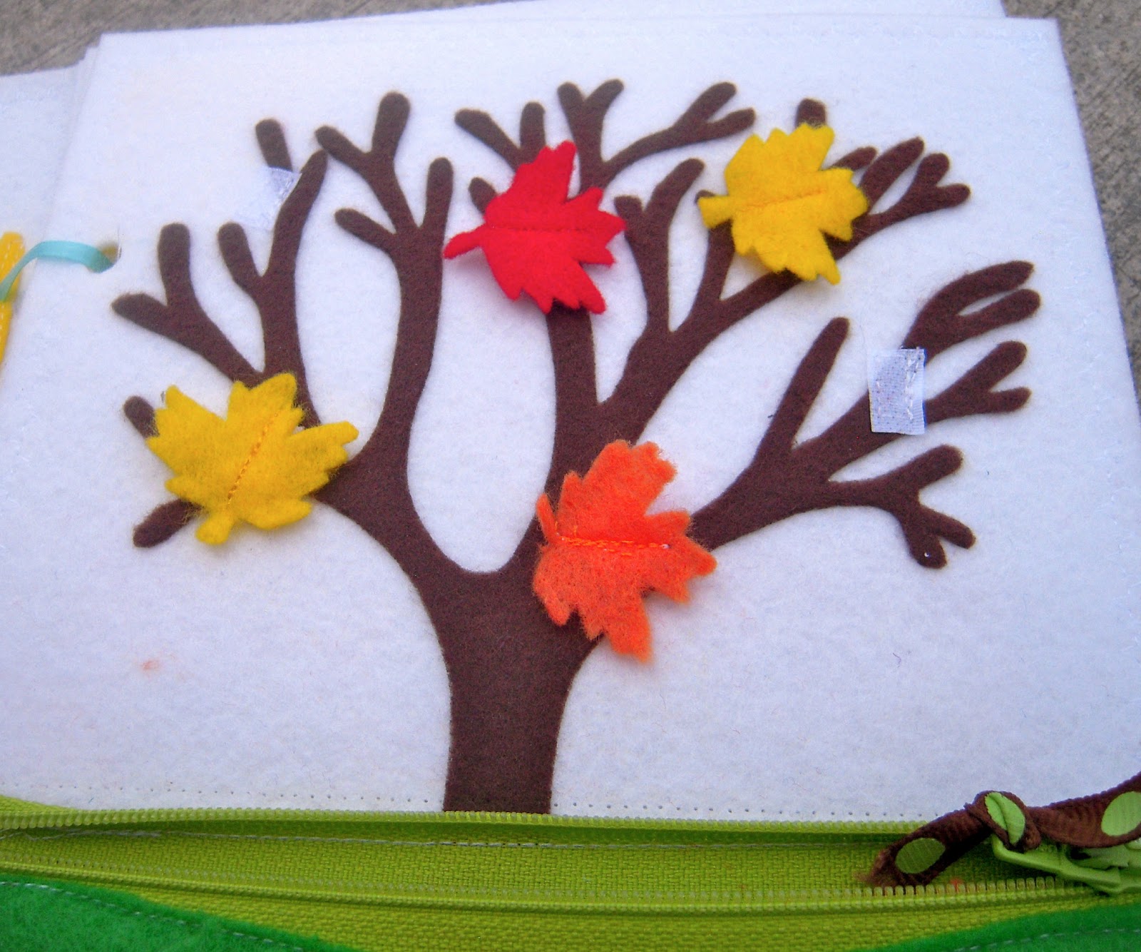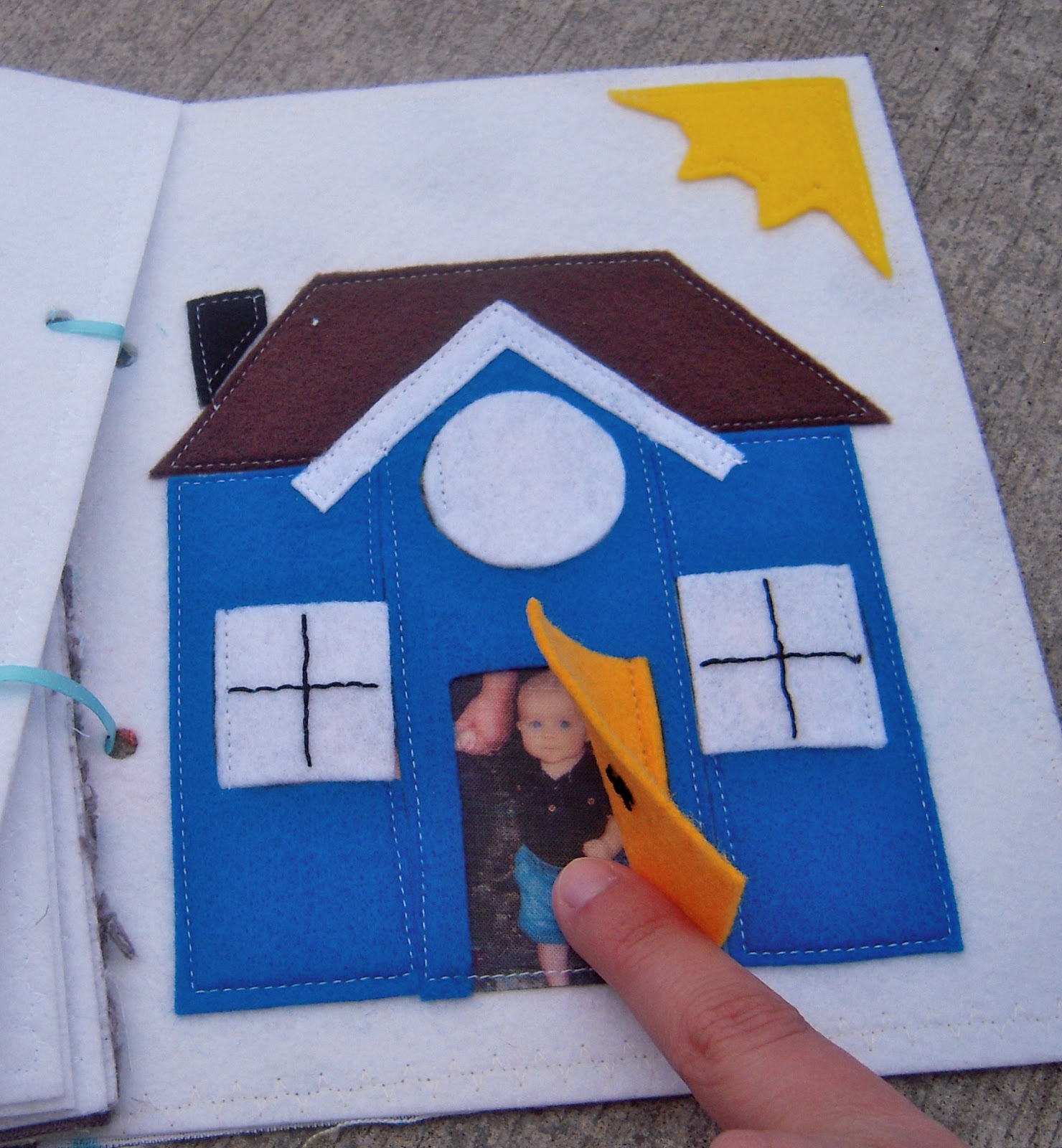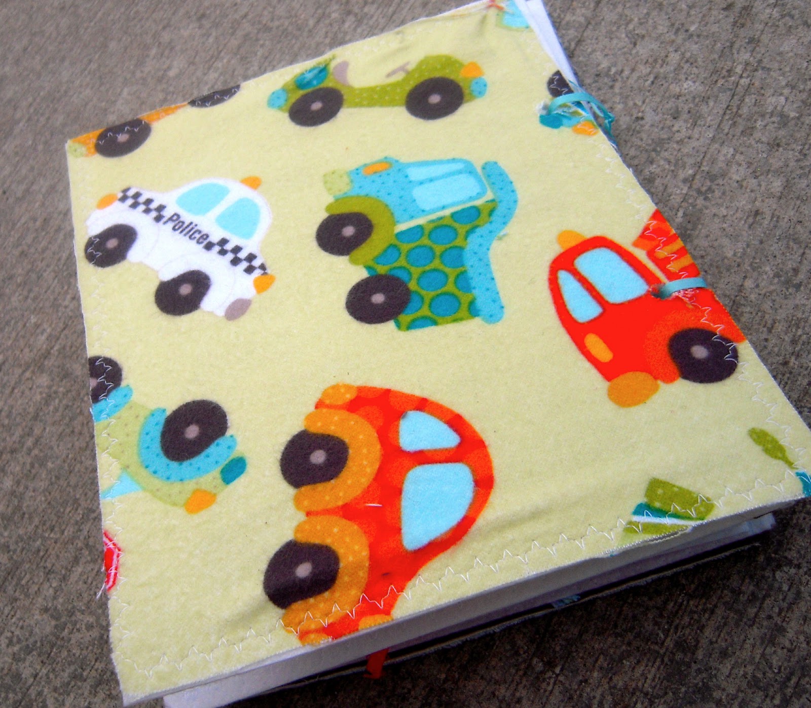 I attached the pages by sewing them together back to back and then punching holes in them (HARD to do through three layers of flannel!) for a ribbon tie.
