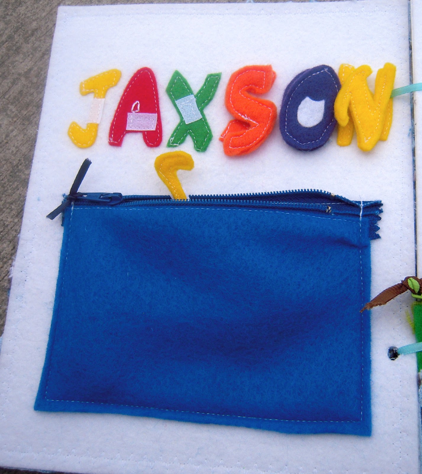 Those N’s and X’s were especially hard to sew by machine. Too bad each of my kids has one in their names! 🙂 I also added ribbon to the zippers to make them easier to grab.