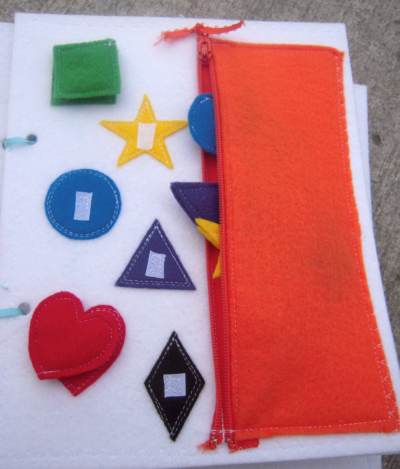 I created a secret board on Pinterest (since I figured all my friends didn’t want their pages overloaded with millions of quiet book pages that looked pretty much the same). “The Quiet Book Blog” was pretty much AMAZING in providing inspiration. I relied on it heavily, as well as the blog “Serving Pink Lemonade.” I finally narrowed my choices based on simplicity, since my kids are only 16 months old and can’t work with snaps or buttons yet, and since I only had two weeks to accomplish it – no complicated hand embroidery for me! Almost everything was done by machine and I used lots of Heat N Bond.