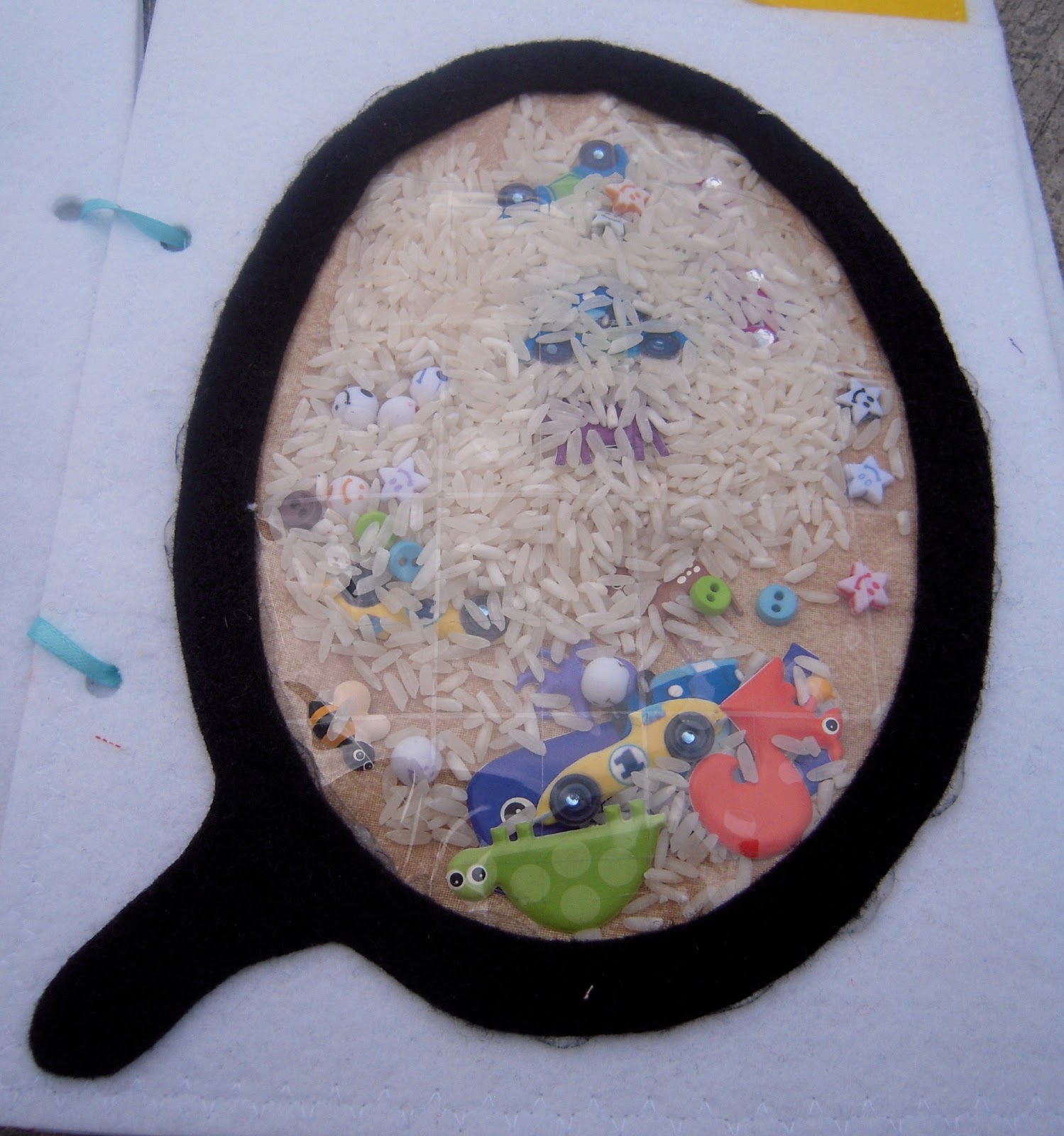 It’s filled with rice, 3D stickers of woodland creatures and cars (with tape on the back to keep them from sticking to things), beads, and some buttons.