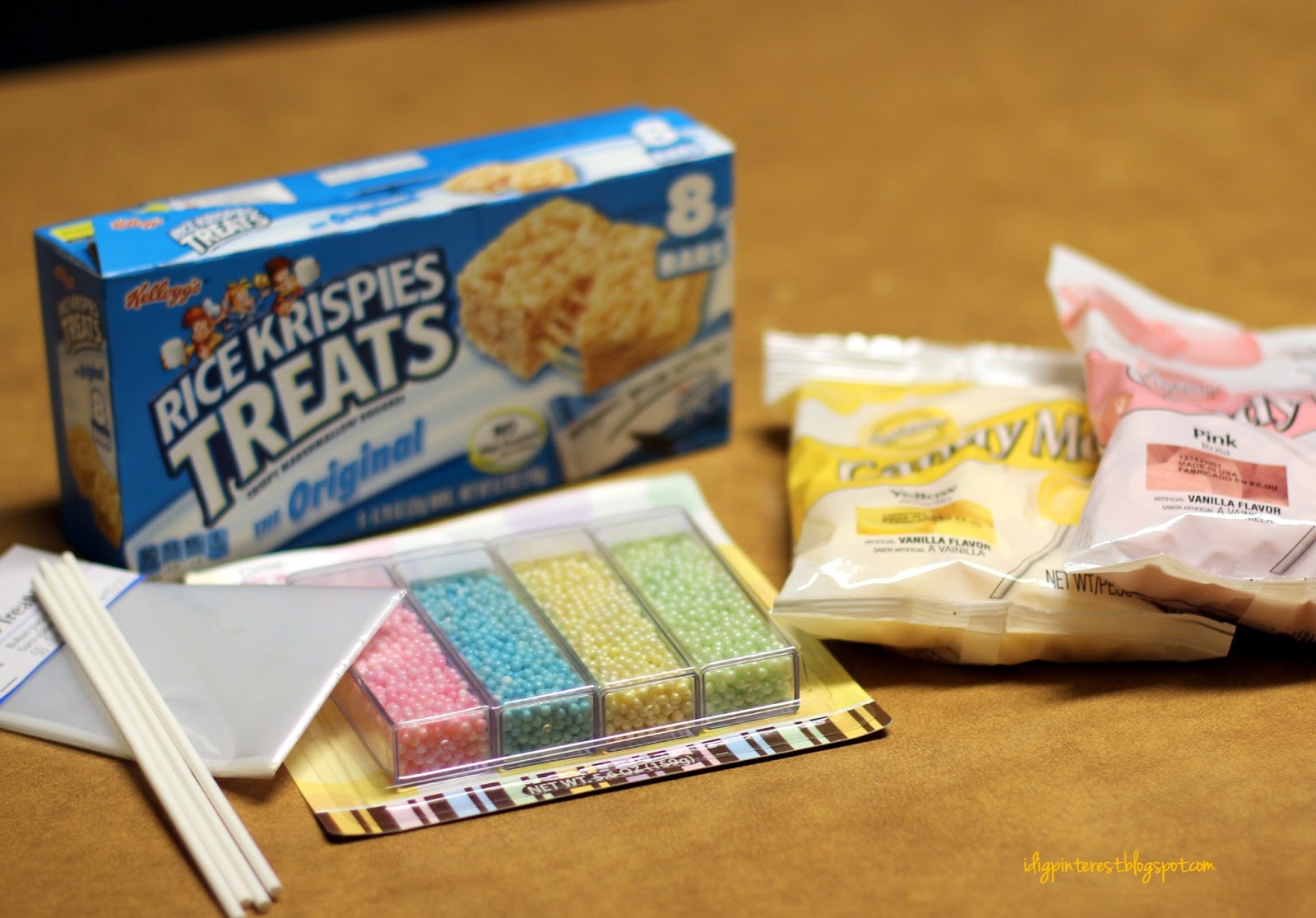 Dip your Krispie squares in the melted candy and immediately sprinkle with edible pearls. Poke into the prepared box or styrofoam and let set.