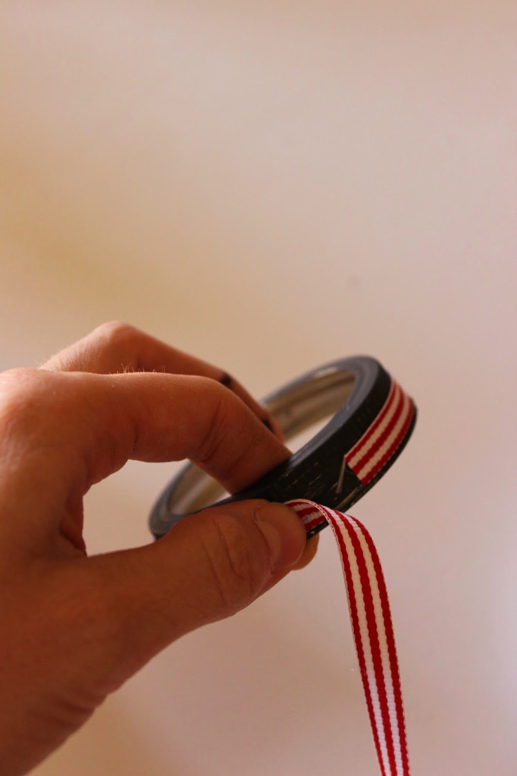 Now tie another piece of red and white striped ribbon in a bow and hot glue it to the lid. I glued mine over the seam to cover it nicely.
