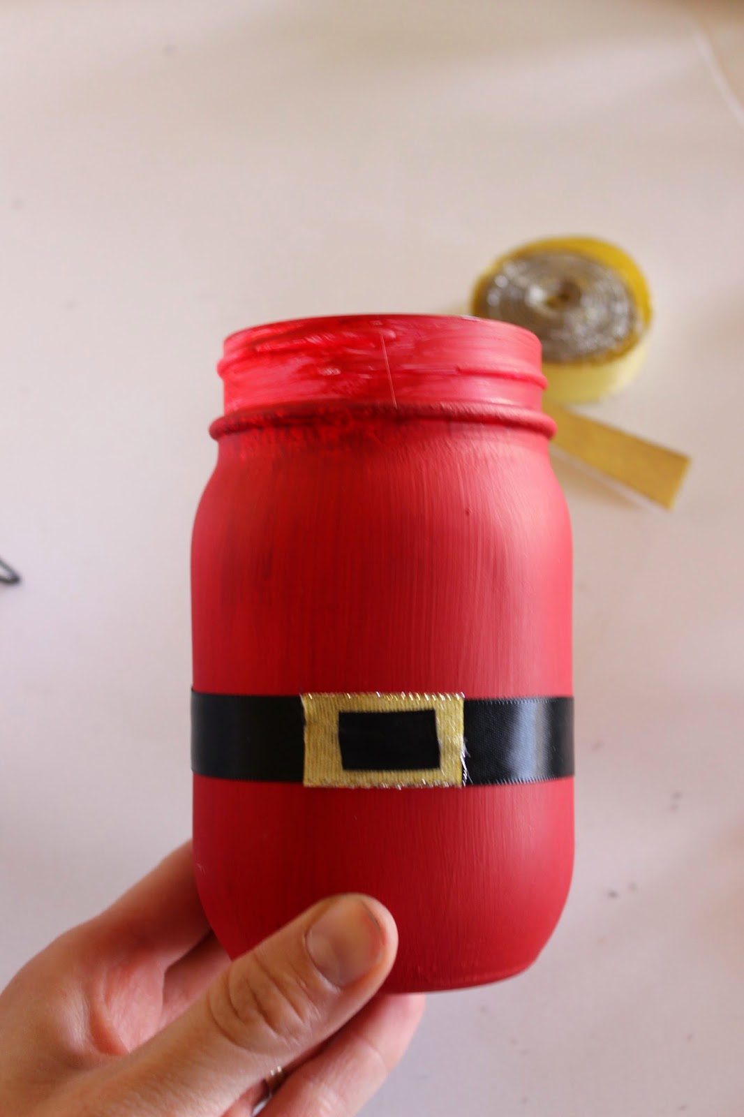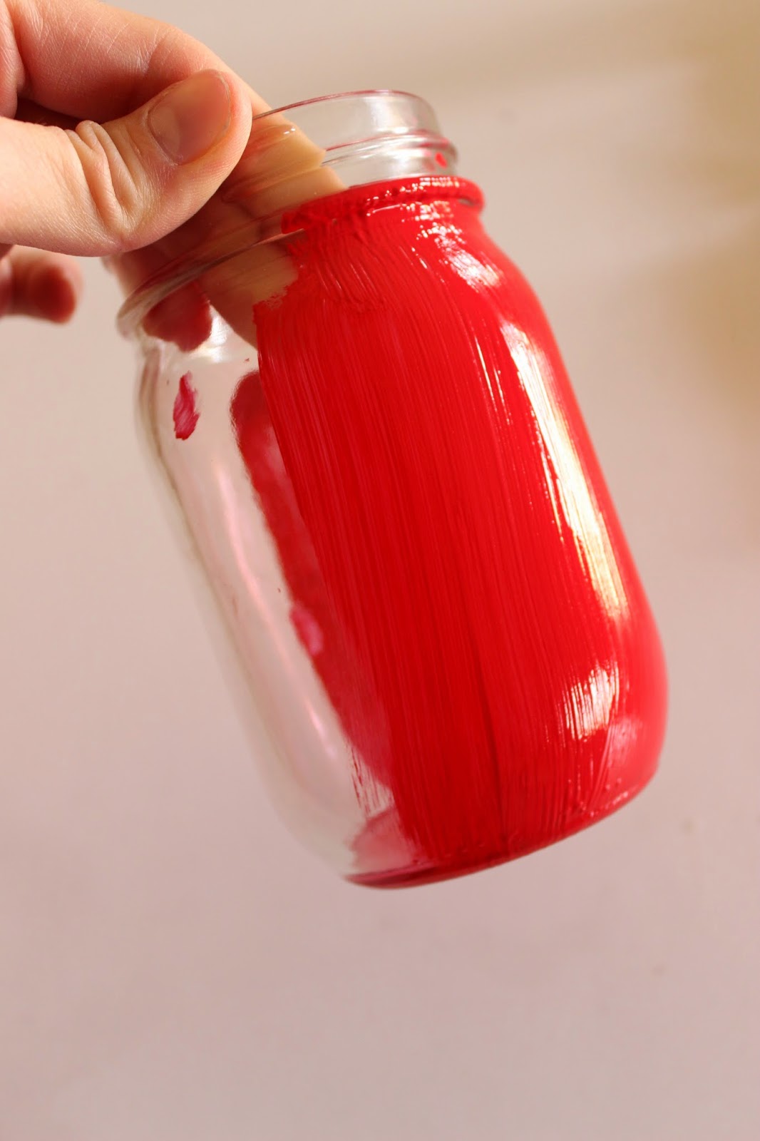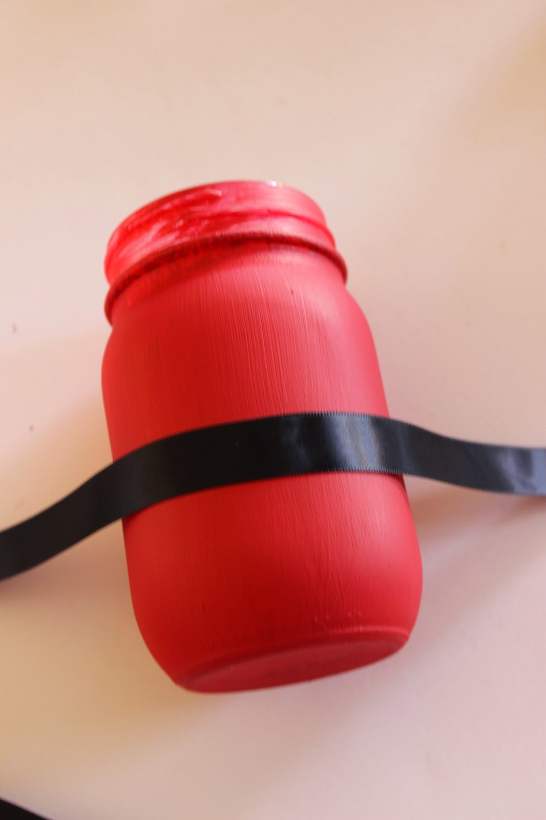 Paint the outside of your jar red. I waited to paint the rim of my jar until the rest was done. I did two coats, allowing it to dry in between.