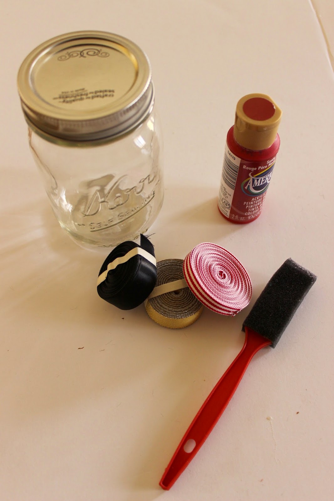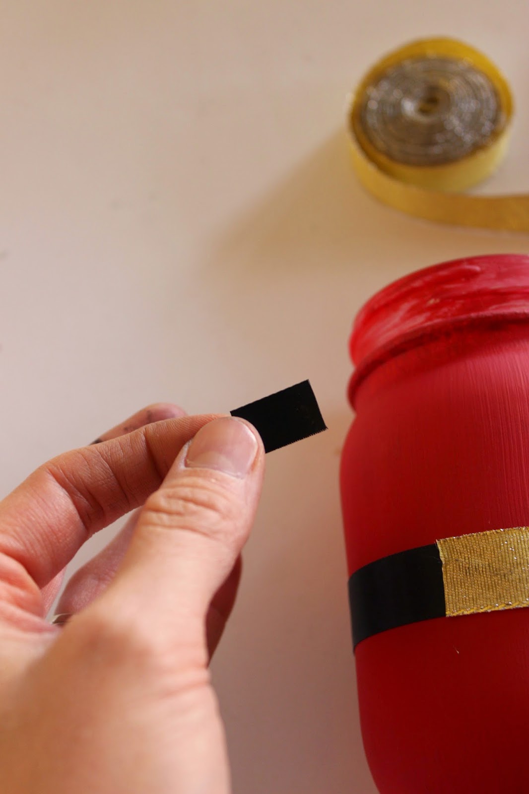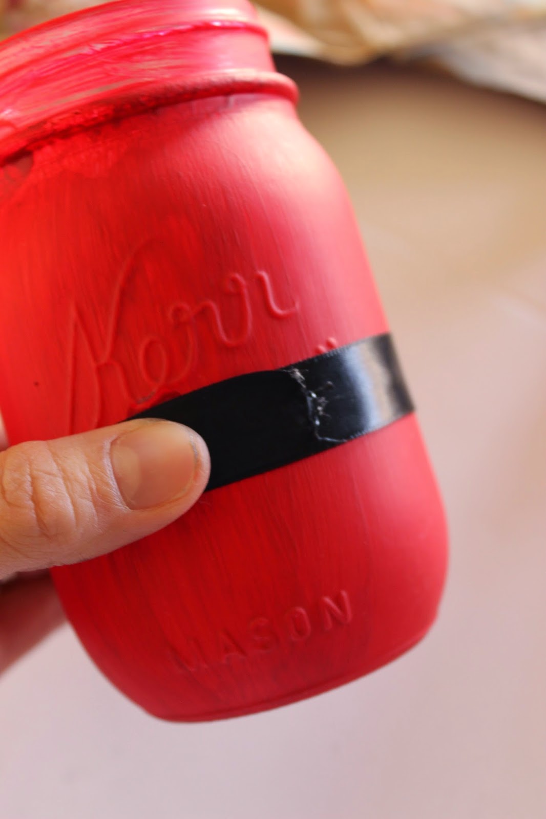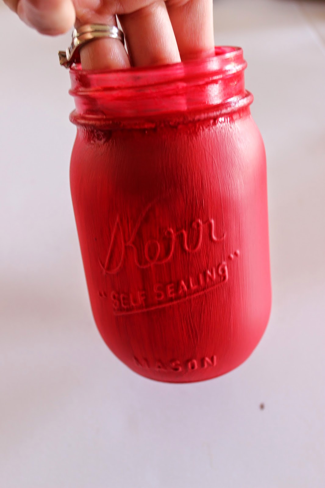 Paint the outside of your jar red. I waited to paint the rim of my jar until the rest was done. I did two coats, allowing it to dry in between.