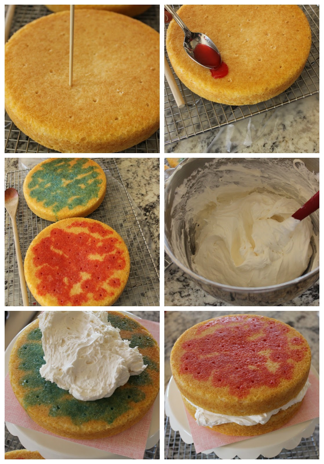 Carefully remove your cakes from the pan, allow to cool completely, then poke holes with the flat end of a wooden skewer, leaving about 1″ between holes. Repeat for both cakes. Using a spoon, pour the red mixture into the holes of one cake (you may not need to use all of it). Do the same with the blue mixture for the other cake.