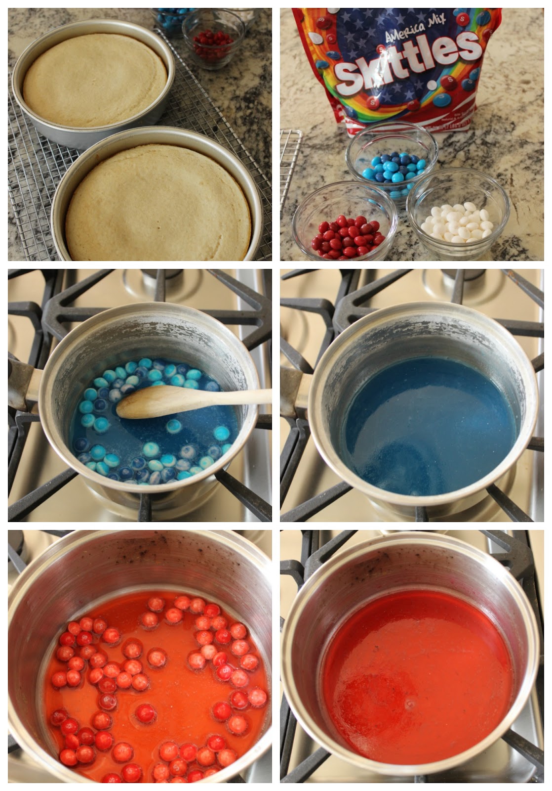 While the cakes are cooling, prepare the Skittles syrup by adding 1/3 c. blue Skittles and 1/4 c. water to a small pot. Stir vigorously over medium heat and allow it to come to a low boil while the Skittles dissolve completely. Remove from heat. You can remove the little white wax pieces with a fork if you’d like. Repeat the process in a separate pot for the red Skittles. Allow mixtures to cool.