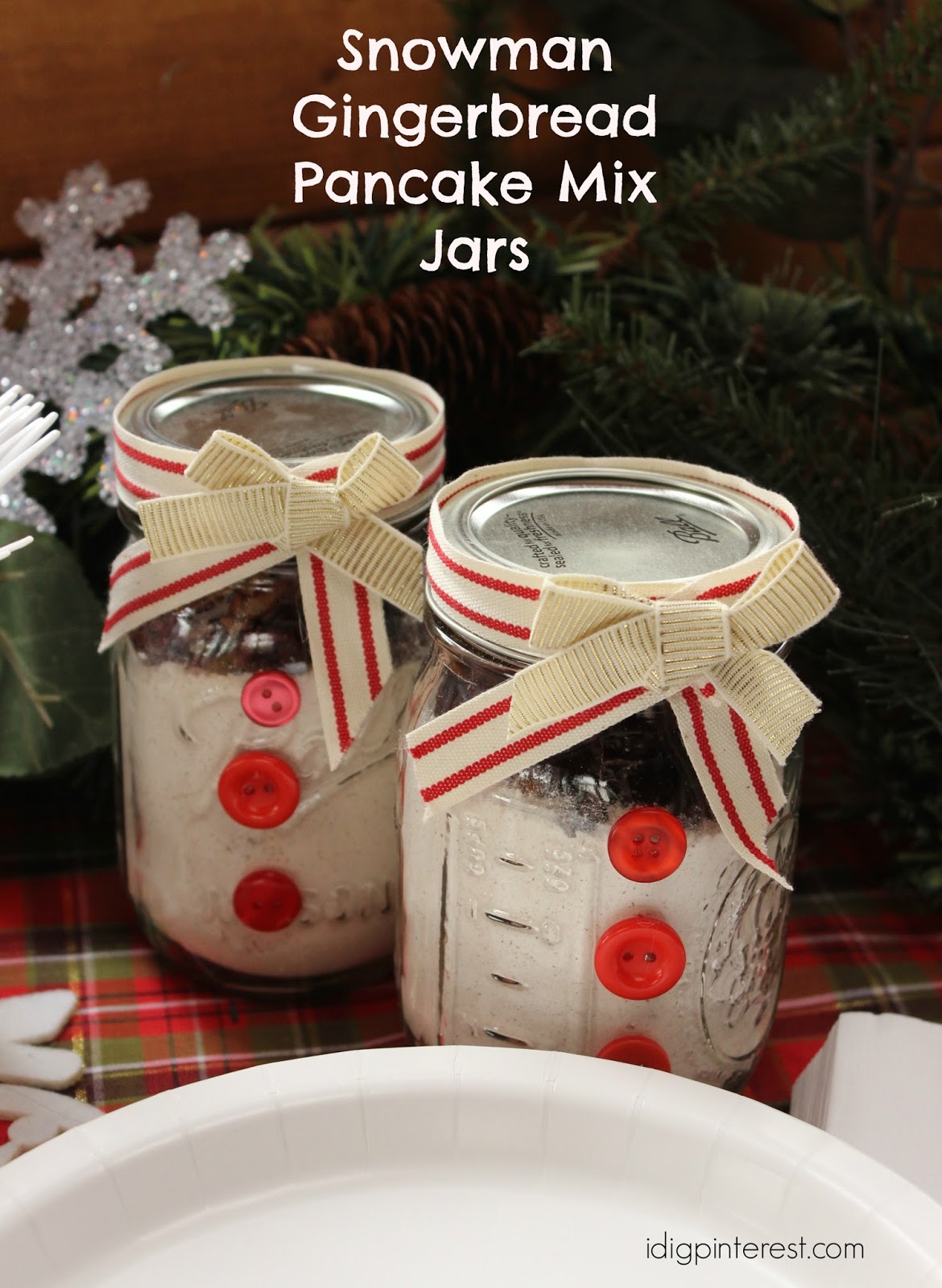 Because it is the season of giving, I wanted to put together a little gift that my family could bring to friends with the delicious Gingerbread Pancake Mix to show our love. I filled pint-sized jars about 3/4 of the way with the pancake mix (recipe below) and then added some dried cranberries and candied pecans to fill the remaining space. I hot glued three buttons in a vertical line on the jar and then hot glued some ribbon and a tied bow around the rim of the lid. I made it to resemble a snowman in keeping with our theme!