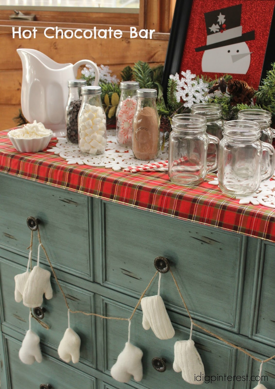 Setting up a hot chocolate bar could not be easier. I placed some fun plaid fabric on top of a decorative dresser in our living area, then placed some foam snowflakes on top of that and a faux pine garland with snowflake pics in the back. I also draped a cute mitten bunting over the knobs, as you’ll see in the top photo.
