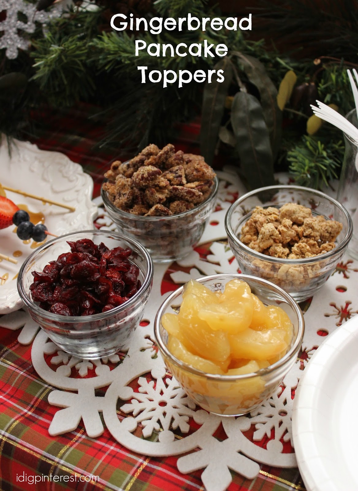 I thought the perfect compliments to the gingerbread flavor would be some candied pecans, oatmeal clusters, dried cranberries, and apple pie filling, and boy was I right! I served them up in mini glass bowls.