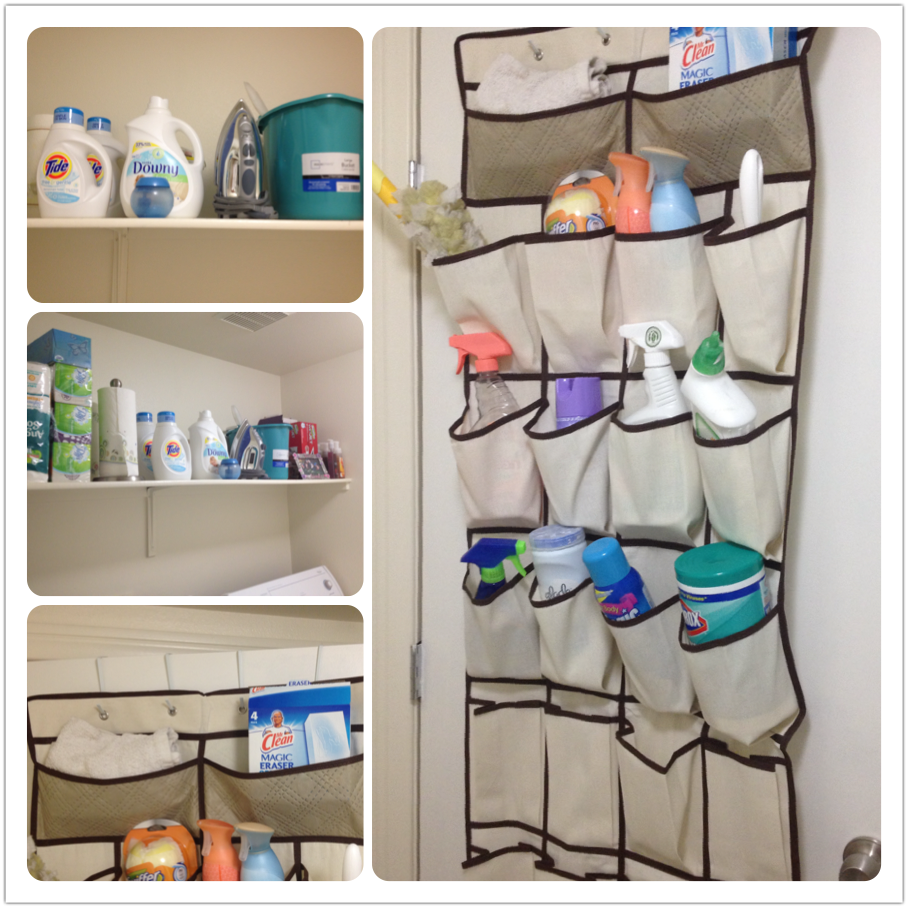My house is in great need of some tender loving care in the deep cleaning department, so I wanted to share some very helpful tips that I’ve gotten from my readers and also found on Pinterest.One of my faithful readers, Alicia, shared this great idea for laundry room organization.  She bought an over-the-door shoe rack at Target and then devoted only 20 minutes to freeing up space and putting all her cleaners/supplies in place.  It looks fantastic!