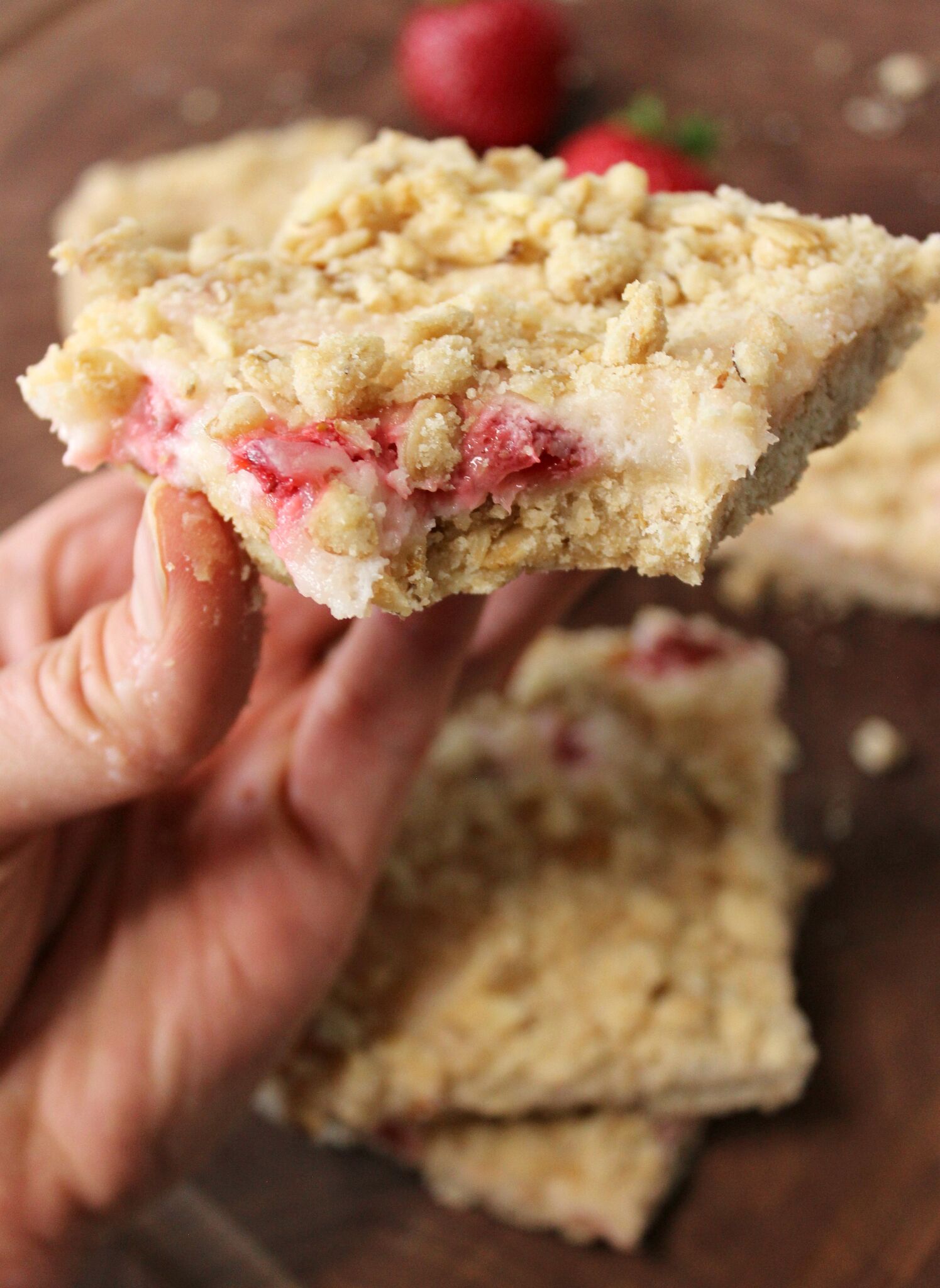 I love a good crumb bar! They’re sort of like pie, but without all the work! And the filling is glorious! Especially in these! The creamy strawberry concoction nestled between the crumb layers is nothing short of perfection!
