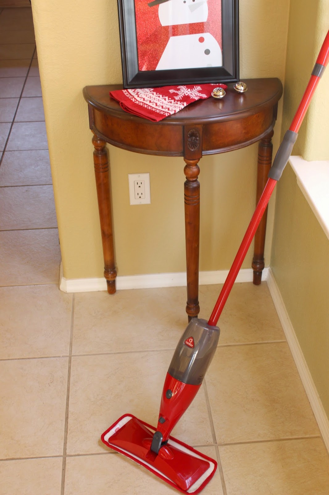 Hosting guests for holiday parties can be so fun, but also lots of work with cleaning, decorating, and food prep, so I’ve compiled a list of tips to help you get your home in ship shape!  Since sparkly floors are a must, I’m letting you in on my secret for the best mop for the job! And, I can’t wait to share how I took a snowman gift bag and a black frame and made them into a fun piece of art/festive holiday decoration!