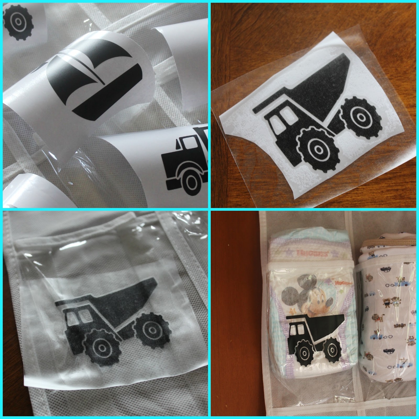 I cut out some truck, airplane, sailboat, tractor and train shapes using my Silhouette machine and some black vinyl. Then I used clear Con-Tact paper to transfer the vinyl designs to every other pocket of the organizer for a fun decor piece that’s also functional! It really is that simple!