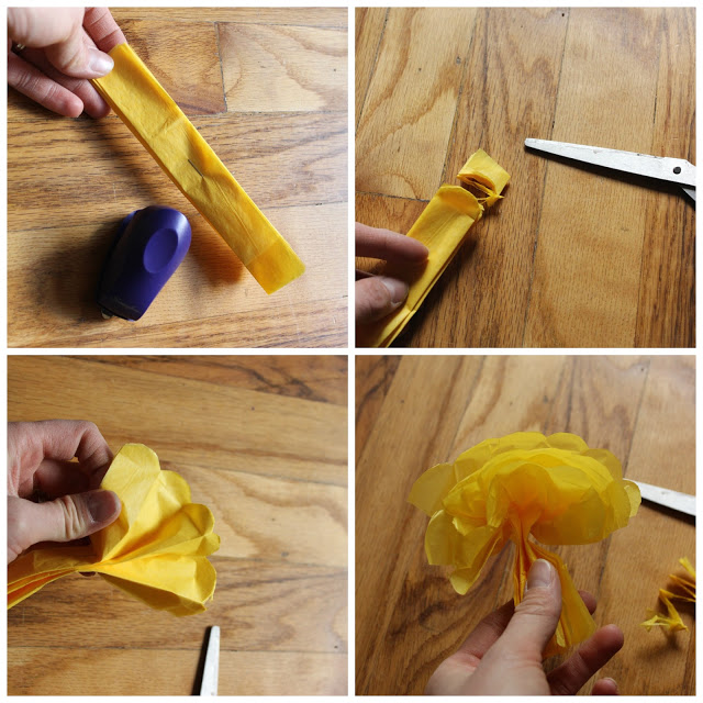 With four layers of tissue paper together (more layers will yield a poofier, fuller flower), cut a square that measures 6″x 6″.  Fold it accordion style.