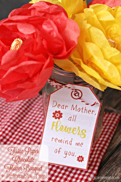 Wish Mom a Happy Mother’s Day with this pretty DIY Tissue Paper Flower Bouquet, with chocolate candy centers and a free printable tag!