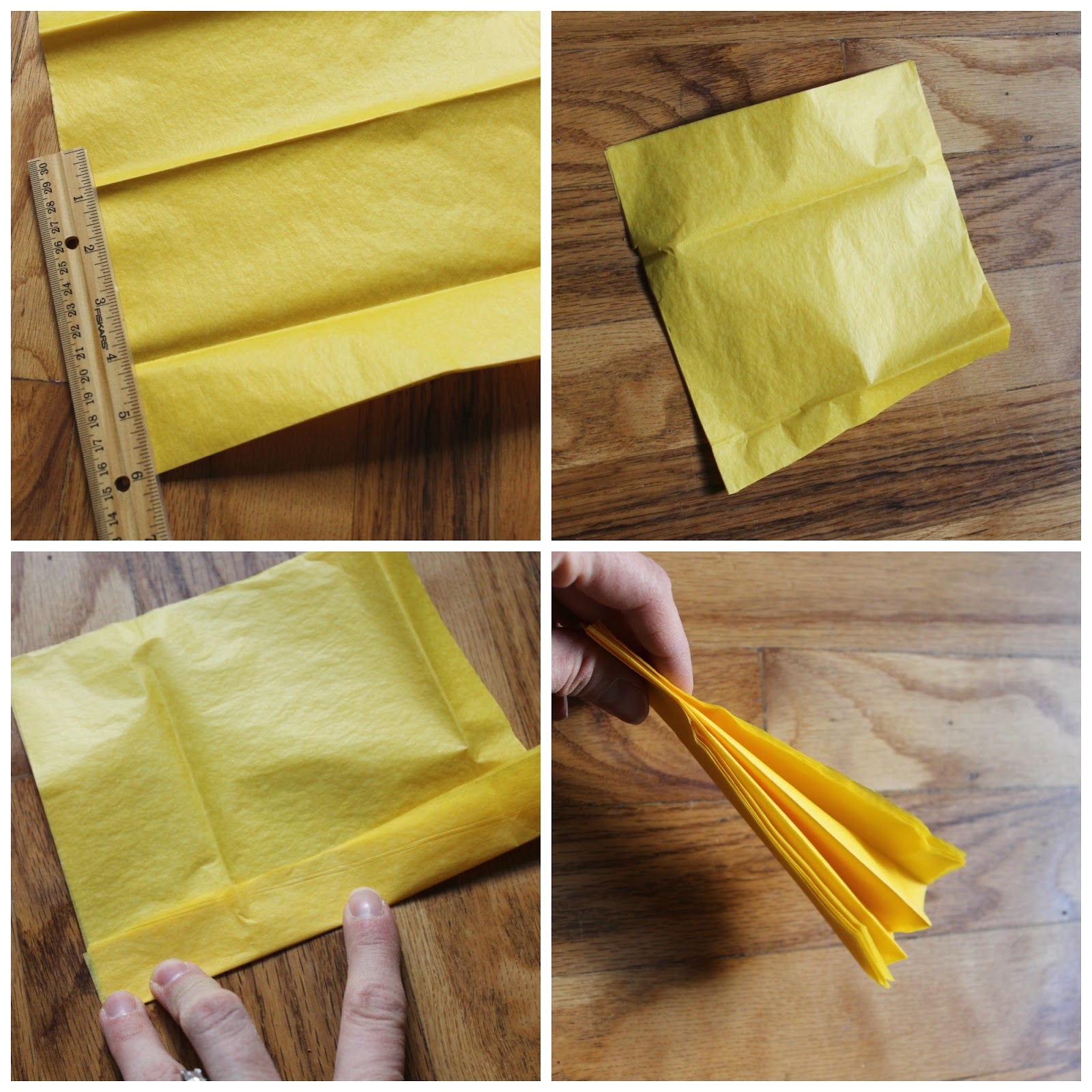 With four layers of tissue paper together (more layers will yield a poofier, fuller flower), cut a square that measures 6″x 6″.  Fold it accordion style.
