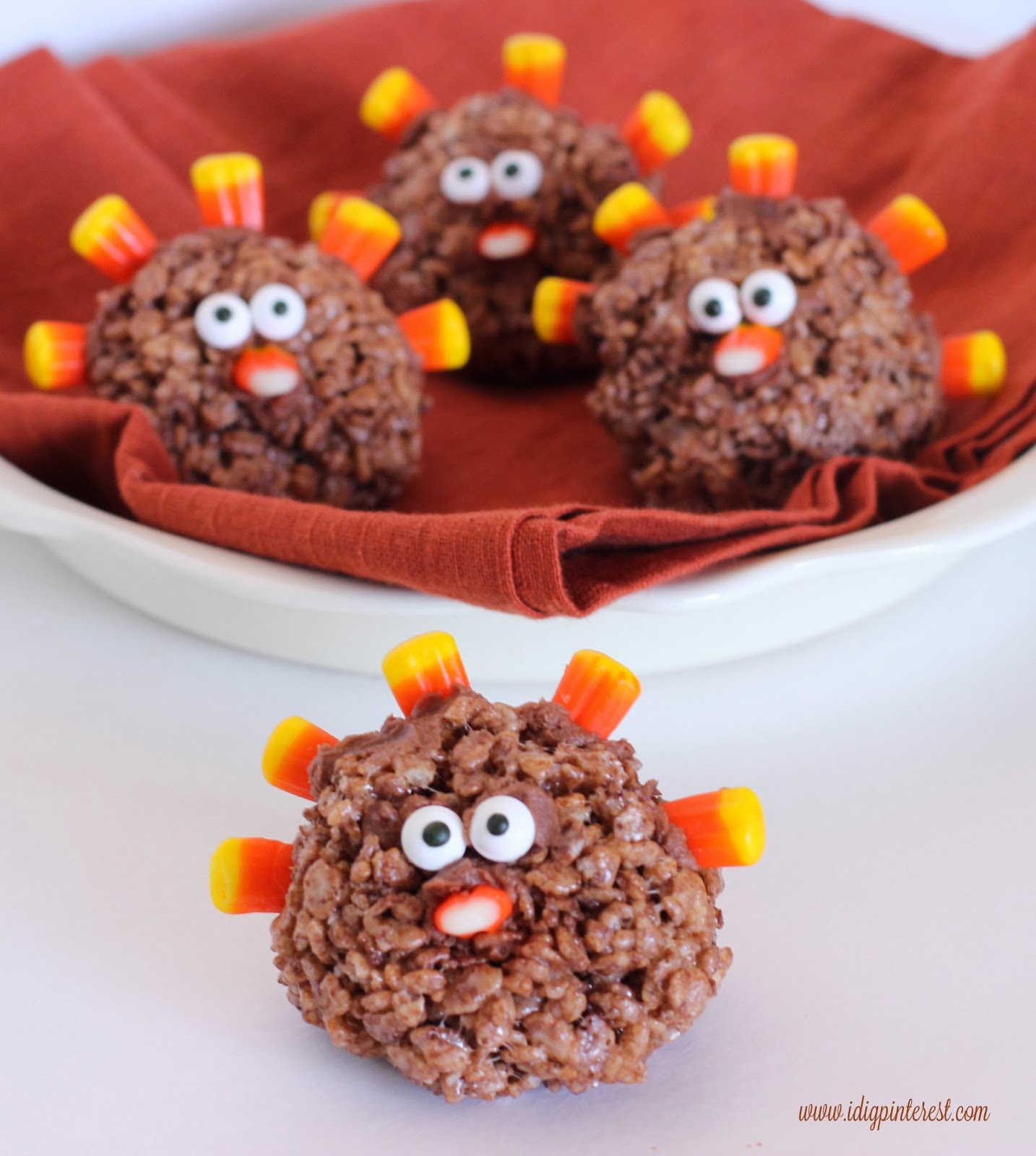 Just make a batch of Cocoa Krispies treats, form into balls, then add edible googly eyes and colorful candy corns for feathers and a beak. Just be sure to work quickly after forming them into balls because the more set they are, the more difficult it is to push in the candy corns.