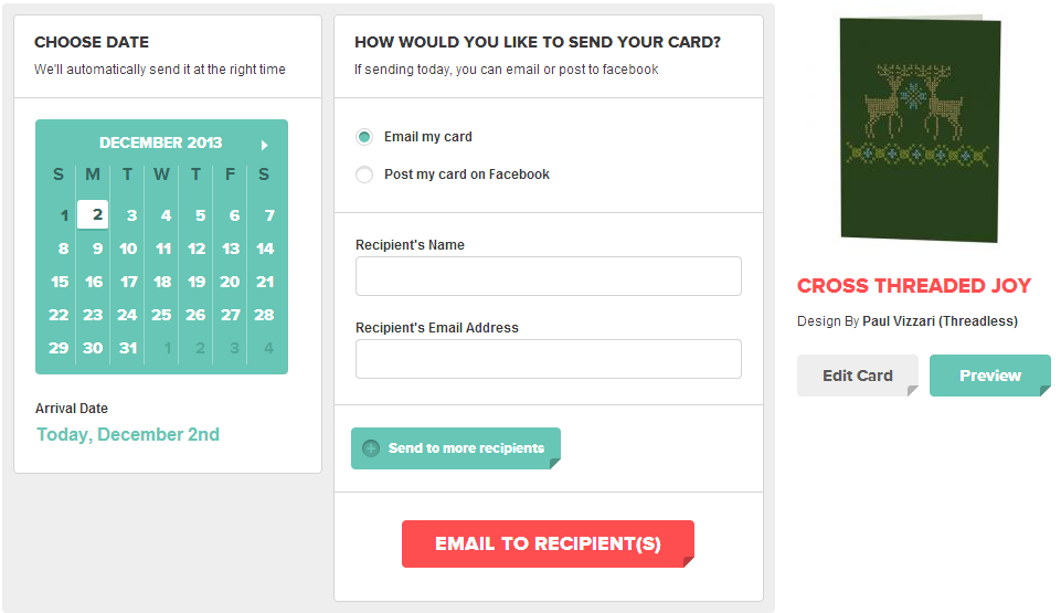 Here’s the completed inside. Now just select how you’d like the card to be sent. If you click “Mail Card”, Open Me will print and deliver it (in 3-5 days) for just $4.