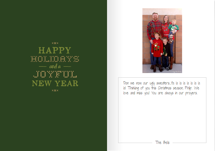 Customize the inside with a photo and personal message. In keeping with the theme, I wrote, “Don we now our ugly sweaters…fa la la la la la la la la!” followed by a “thinking of you note”.