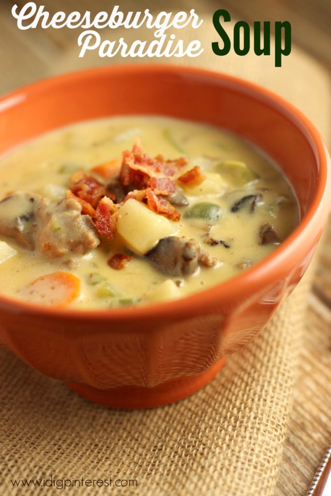 Cheeseburger Paradise Soup. This is a hearty, cheesy, comforting soup that everyone will enjoy! Soups always involve lots of chopping and babysitting, but this one’s worth it, because you won’t have to cook the next night! It makes a ton and we had lots of yummy leftovers!