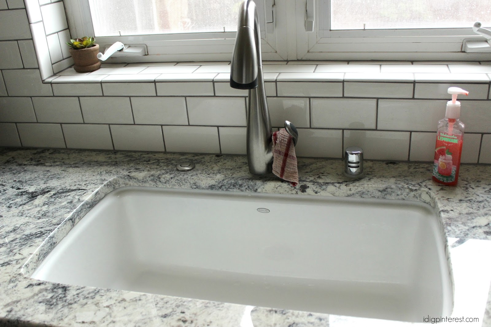 I’d originally wanted a farmhouse sink, but didn’t want to give up precious cabinet space to put one in, so I “settled” (but not really) for an undermount cast iron white porcelain Kohler large single basin sink. I seriously love that I can just swipe the crumbs right into it and there’s no pesky lip to deal with! It just looks so clean and seamless too! And, it can hide hold about a bajillion dirty dishes, so now I’m in a bad (or is it good?) habit of forgetting about them for a long while. 🙂