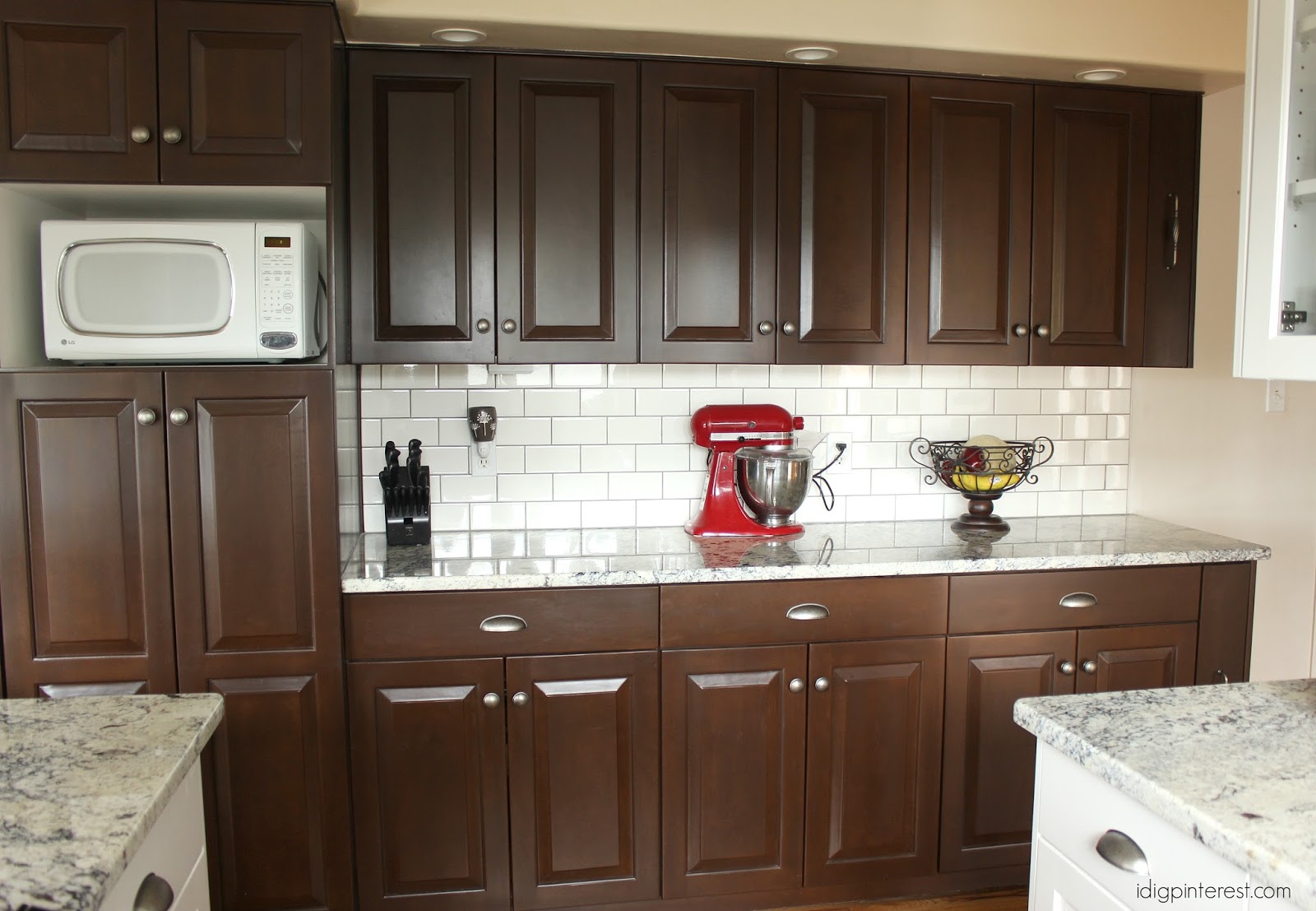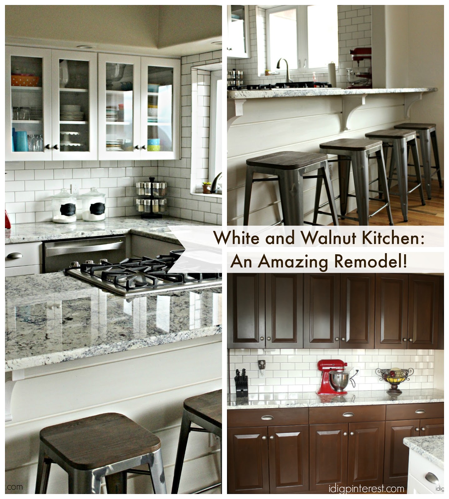The shaker-style cabinets are Maple, which made our contractor cringe when we asked him to find someone to paint over them, but I wasn’t a fan of the original light wood color. I’d always wanted a bright, clean-looking kitchen, so I wanted to go ahead and have all the cabinets painted white. Those plans changed when my husband suggested that since the wood grain was so nice on the one straight side of the kitchen, that we stain it instead. I am SO glad we chose to do this, because the walnut color adds an important richness and warmth and prevents the “hospital”, “washed-out” look.