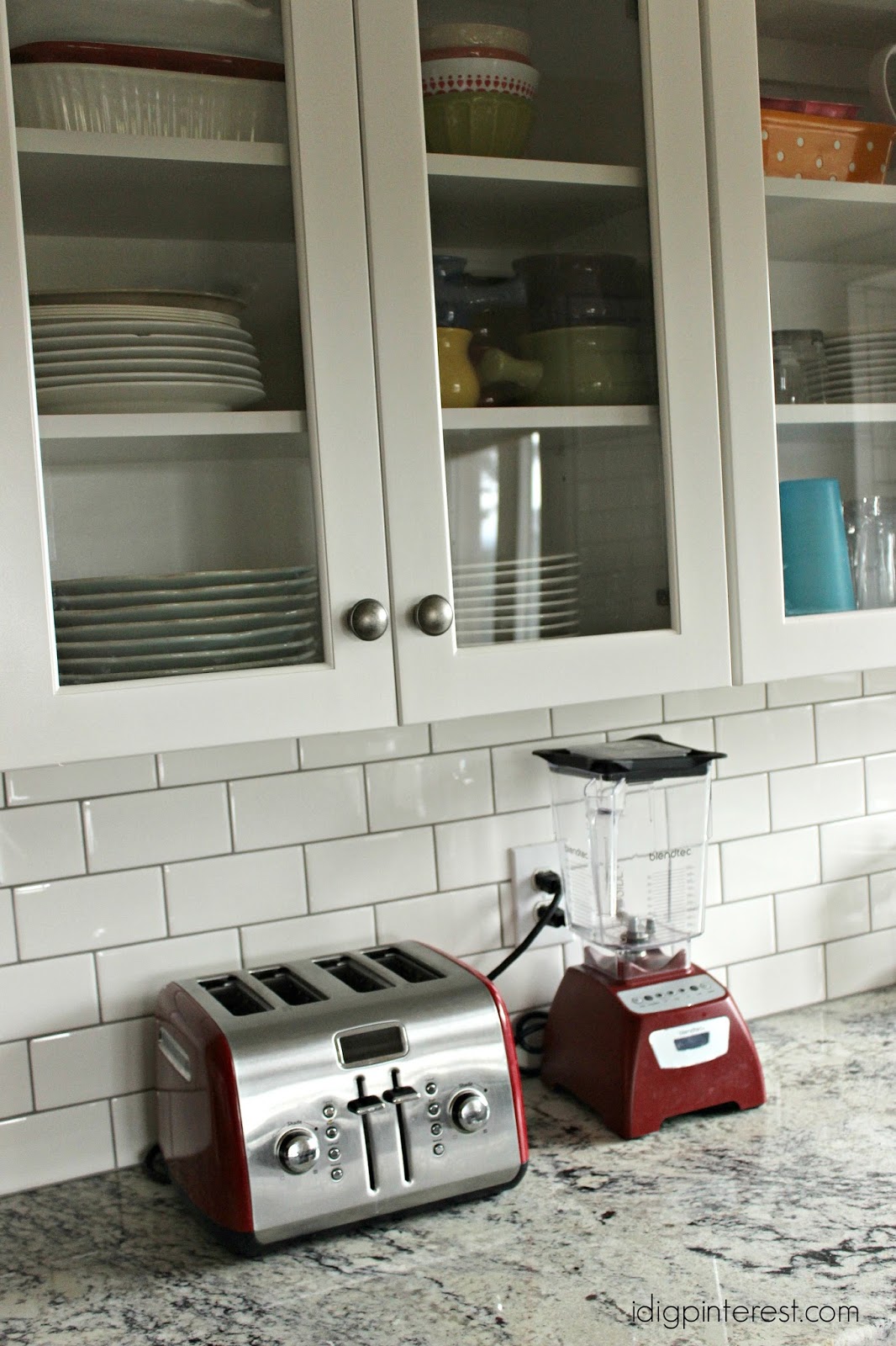I was so glad that we already had these glass front cabinets to show off my dishes! The white cabinets bring out the colorful contents inside even more!