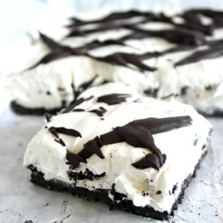 Make the chocolate ganache by adding the dark chocolate chips and 3 Tbsp. heavy cream to a small pan over medium-low heat and stirring it constantly until the chocolate is melted and the mixture is smooth. Drizzle over the cheesecake bars and freeze for 1-2 hours or place in the fridge for 3-4 hours before serving so it can set and chill through.